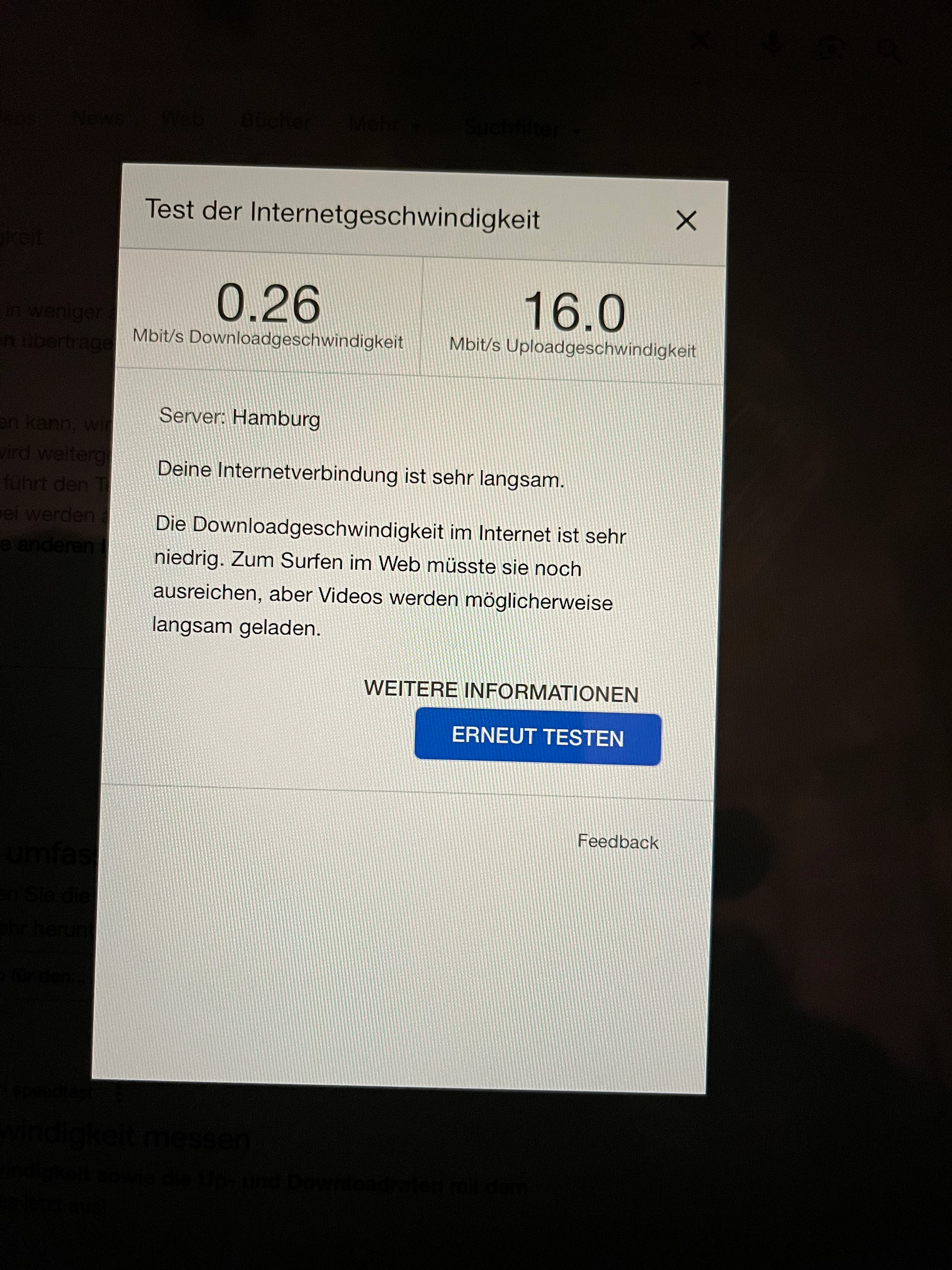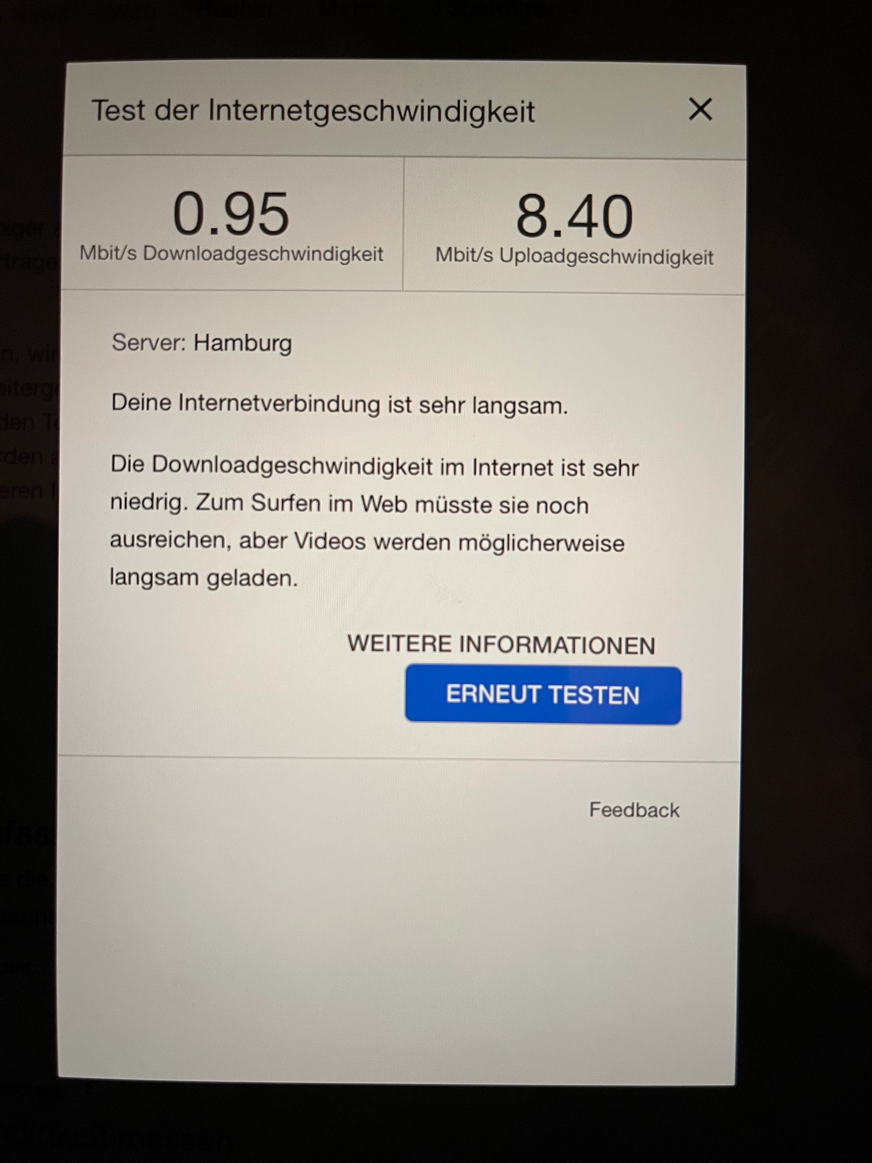 • Performance: Wenn es läuft, kommen manchmal statt der vertraglichen 50 Mbit/s oft nur 8 Mbit/s an. Streaming am TV bricht dementsprechend alle 10 Minuten ab.