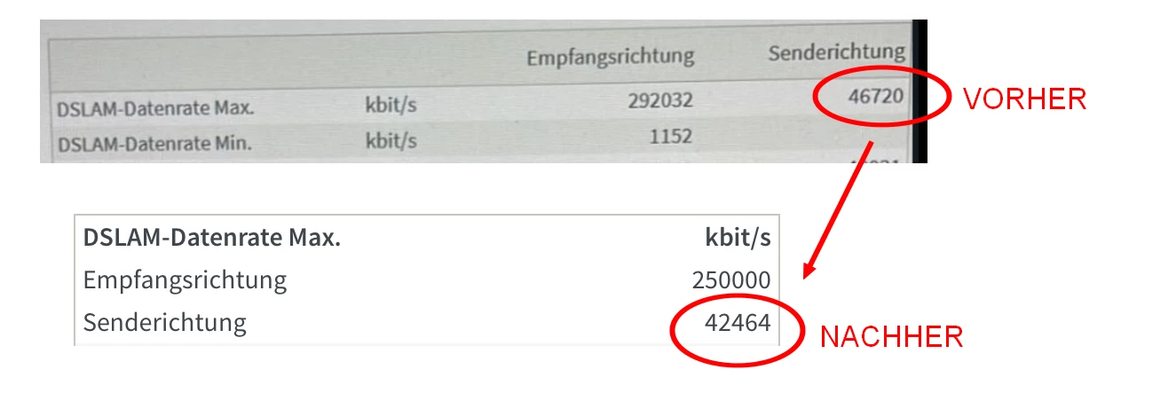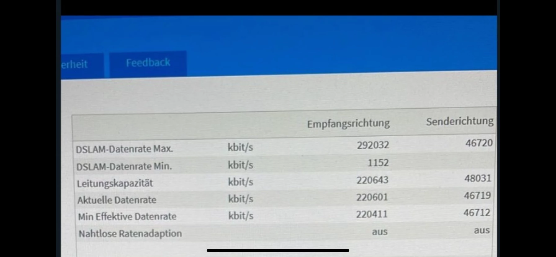 Hallo liebes o2 Team. Ich hatte in letzter Zeit viele resyncs da mein TAE Stecker nenn Wackler hatte, nach dem Austausch war ruhe. Und seid gestern nacht bzw heute morgen wurde meine DSLAM Datenraten im ds auf 250 runtergesetzt. Was an für sich nicht schlimm ist da eh nur 240 ankommen. Aber mein upstream is leider auf 39 runtergeschraubt worden, sonst hatte ich immer 44 im speedtest. Ich weiß das sind nur 5 mbit, machen sich aber tatsächlich zeitlich bemerkbar wenn man viel hochlädt 😁.