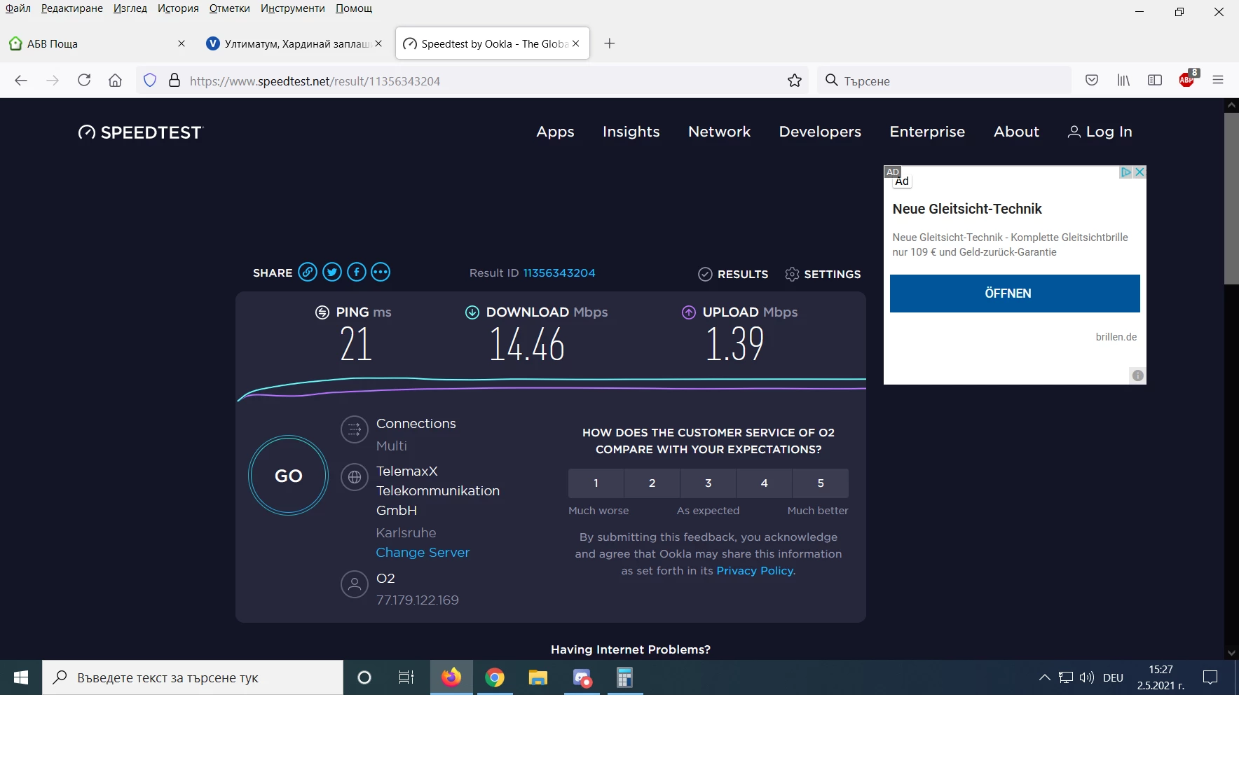Wir haben einen Vertrag zur Internetlieferung von O2. Dieser Vertrag wird von O2 in einem Teil der Verbindungsparameter nicht erfüllt. Wir erhalten eine Geschwindigkeit von 15 Mbit/s bei einer vereinbarten Geschwindigkeit von 50 Mbit/s für 21 Monate. Unser Vertrag läuft ab 2.10.2019. Bis zum 2. Oktober 2021. Für diese Zeit haben wir viele Male über das Internet und einen Besuch in einem Büroladen versucht, mit O2 Kontakt aufzunehmen, um dieses Problem zu lösen. Trotz unserer Bemühungen sind wir gescheitert. Wir fühlen uns von O2 betrogen. Wie können wir Schadensersatz bekommen? von O2 über uns.Oder um die Qualität der Verbindung zu verbessern.
