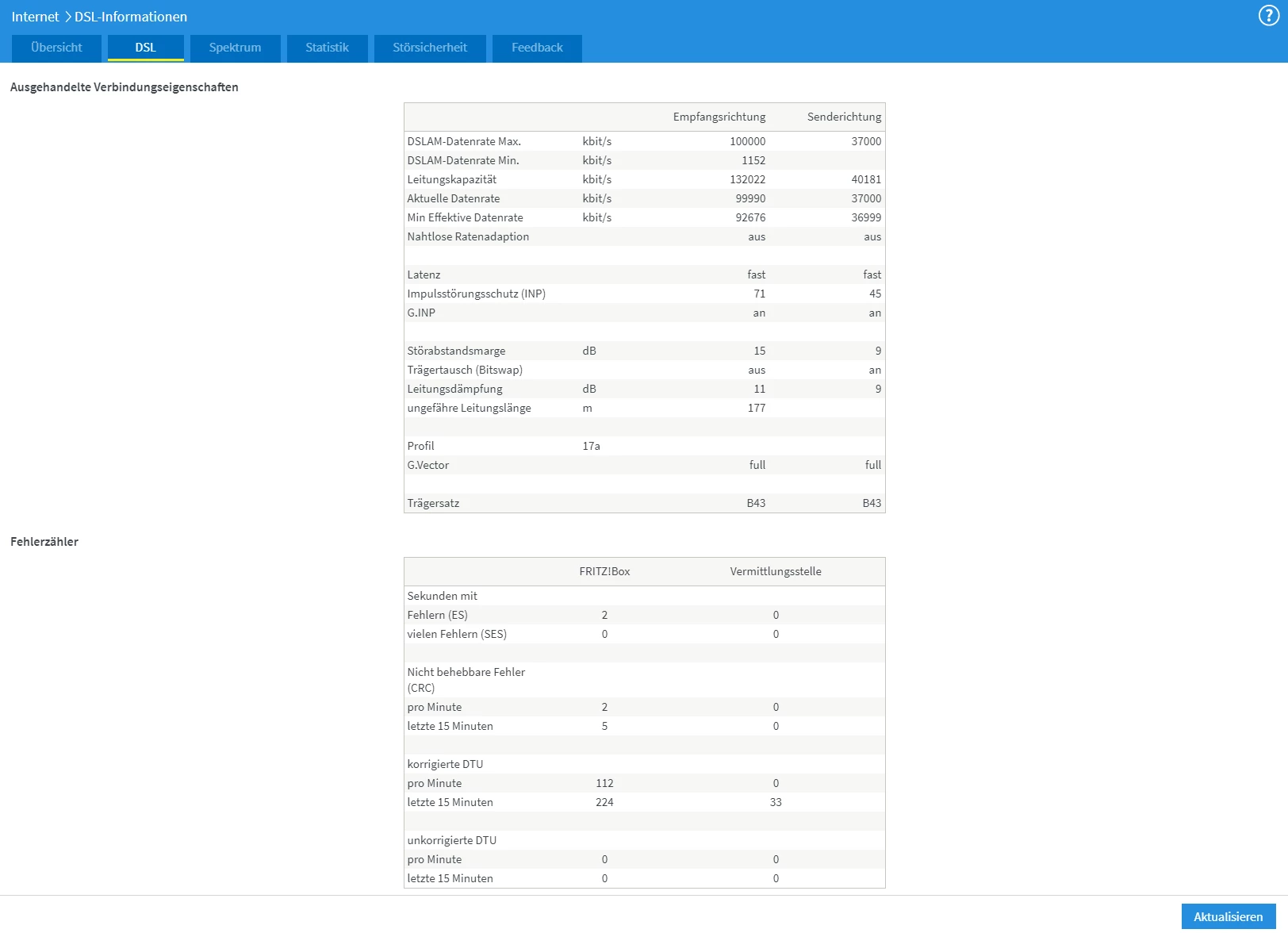 Dann bitte einen Screenshot der Tabelle unter dem Reiter “DSL” mit allen Leitungsparametern und den Fehlerzählern posten.