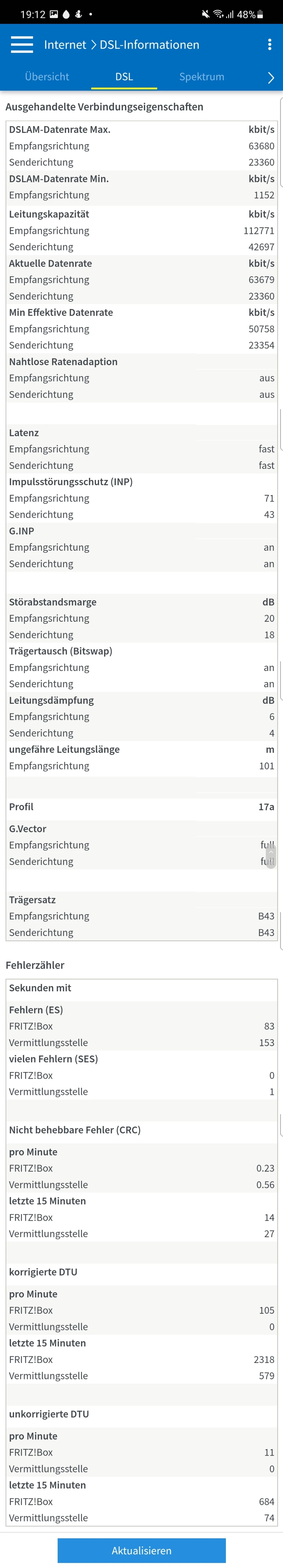 @Anychee  Die Störung kommt von außen. Die ganzen Werte passen nicht zusammen. Melde eine WiederholungsStörung die sollen die Leitung messen ins Haus und eine galvanische Messung.