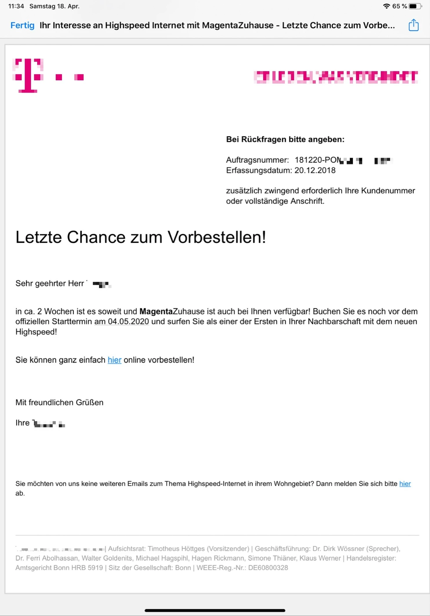 Habe Rücksprache mit meinem Nachbarn gehalten (Homeoffice sei dank :wink: ), dem hatte ich von der Änderung gestern erzählt. Hatte er selbst noch gar nicht bemerkt. Er hat heute mehr Speed gebucht (Magenta XL, 175MBit, ist Telekom Kunde) und ihm wurde der 05.05. als Termin genannt. Ich bleibe da mal dran, wenn es bei ihm soweit ist müsste es auch ja auch bei mir soweit sein.