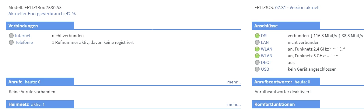 ich benutze O2 Internet seit 3 Monaten ohne Probleme. Ich habe FRITZ!Box 7530 AX Router. Vor etwa einer Woche ist das Internet in der Nacht verschwunden. O2 Techniker kam und hat etwas mit den Routereinstellungen gemacht und das Internet wurde wiederhergestellt. Drei Tage später verschwindet das Internet gegen 4:00 Uhr wieder. Leider habe ich ihn damals nicht gefragt, was er genau gemacht hat. Er sagte, dass das Problem nicht bei der Kabel- und DSL-Verbindung liegt, sondern bei den Router-Einstellungen.
