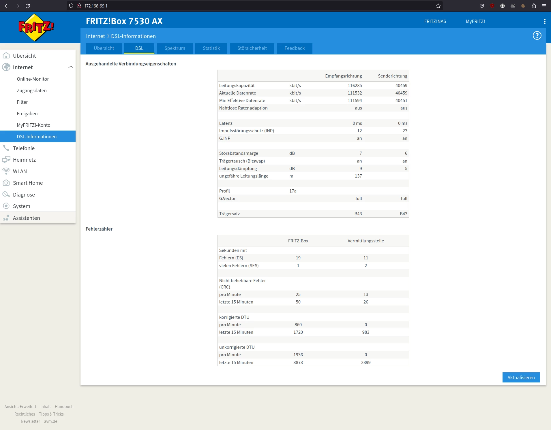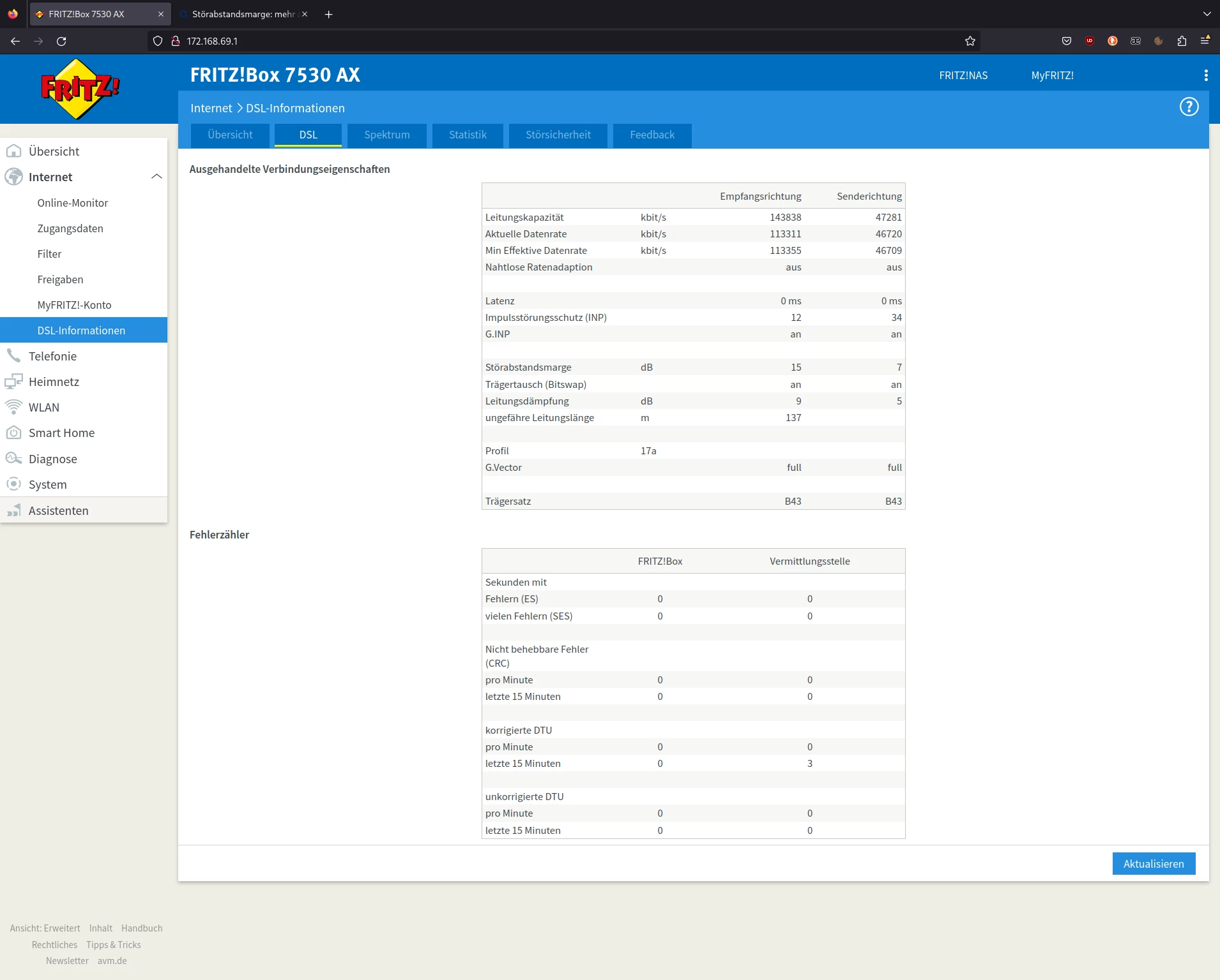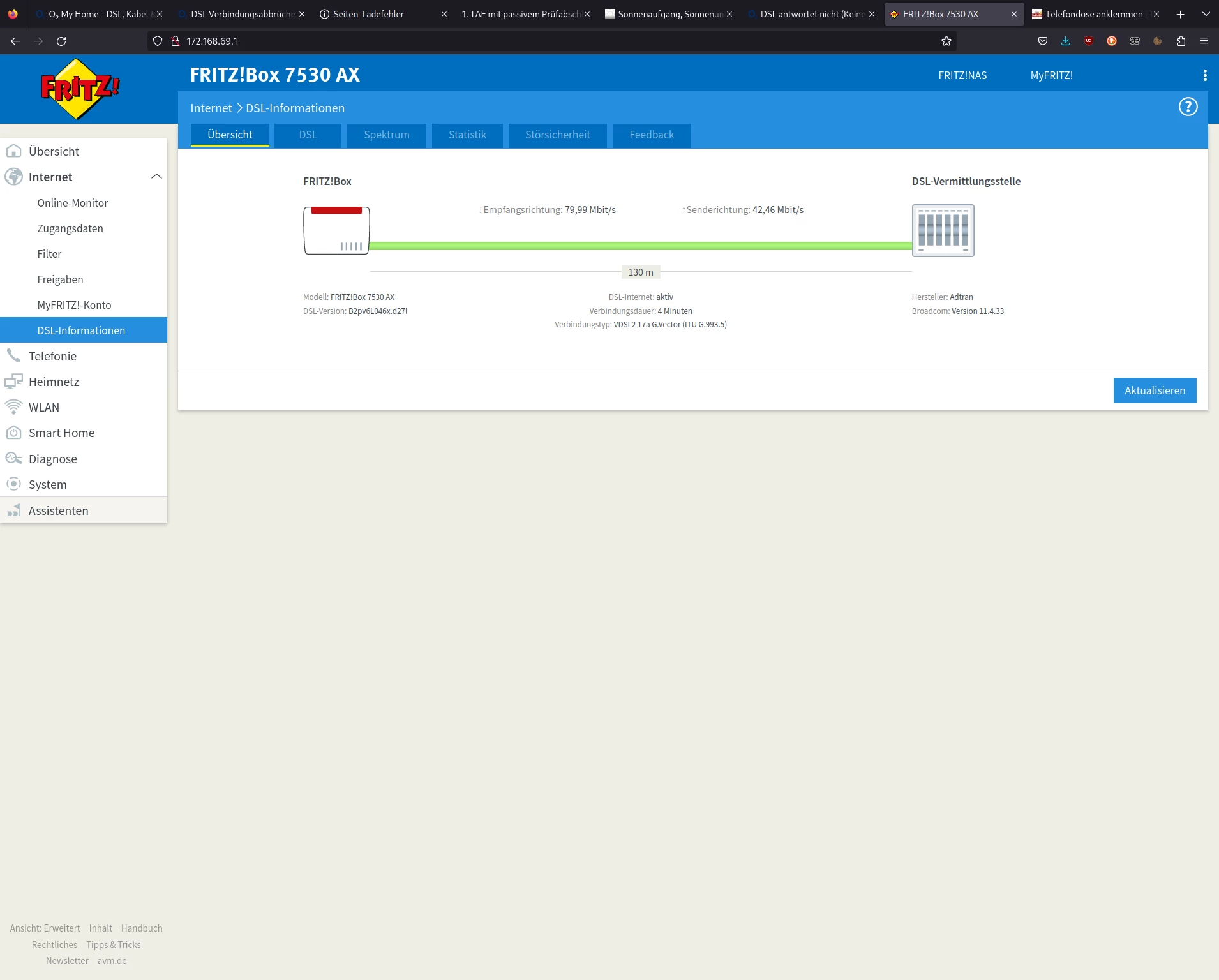 Leider hat sich der Router in den 3 Wochen wo ich hier wohne nun so oft neu verbunden, dass das DLM (Dynamic Line Management) meine Geschwindigkeit in Empfangsrichtung/Senderichtung auf 80000 / 42463 Kbit/s deckelt. Anfangs hatte sich der Router noch mit den vollen 116 / 46 Mbit/s synchronisiert.