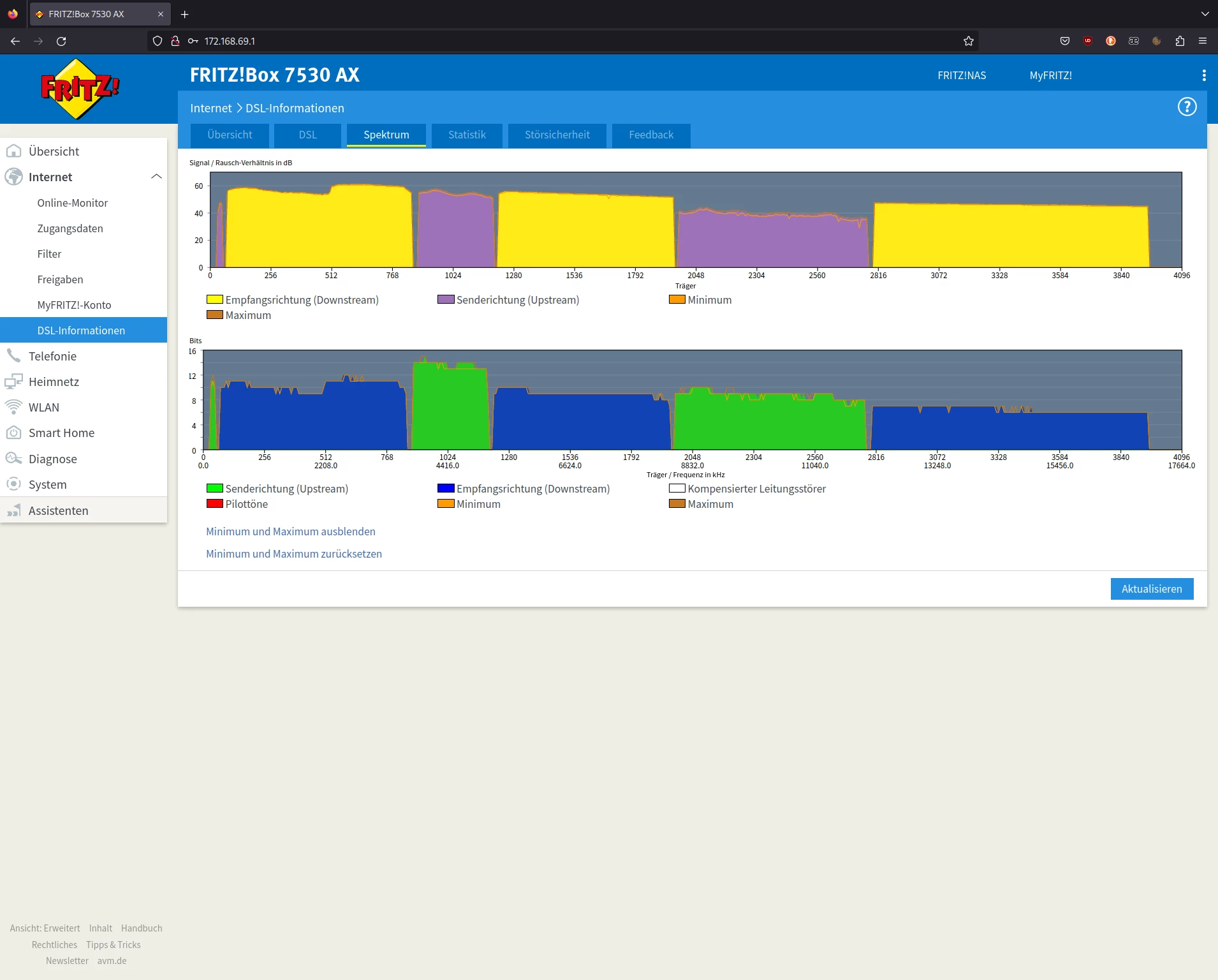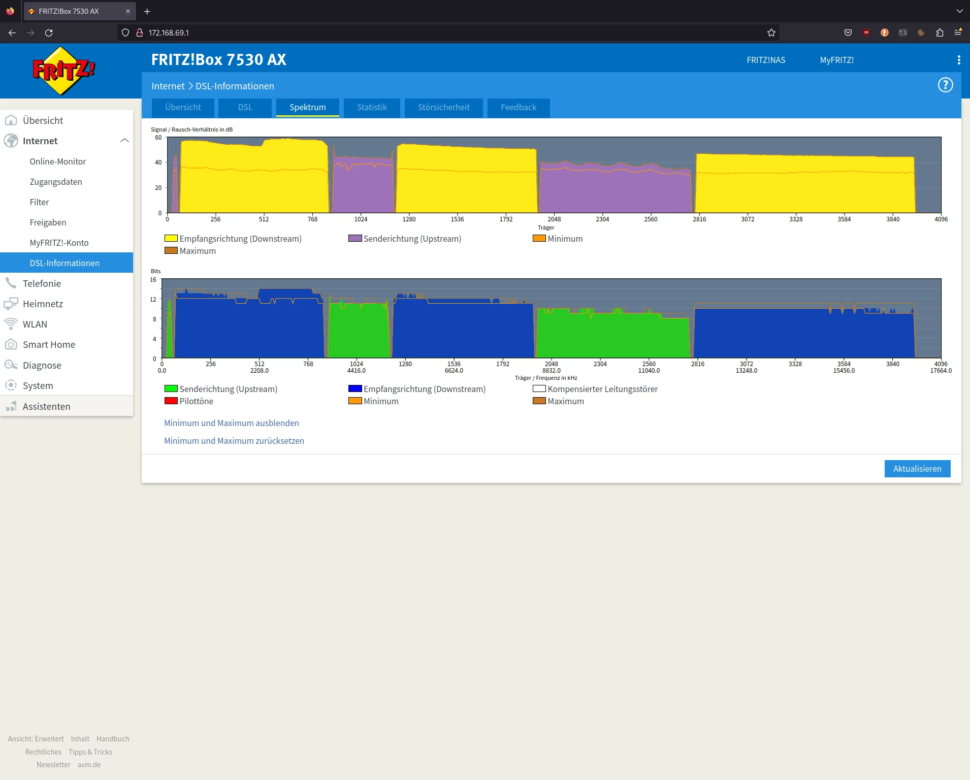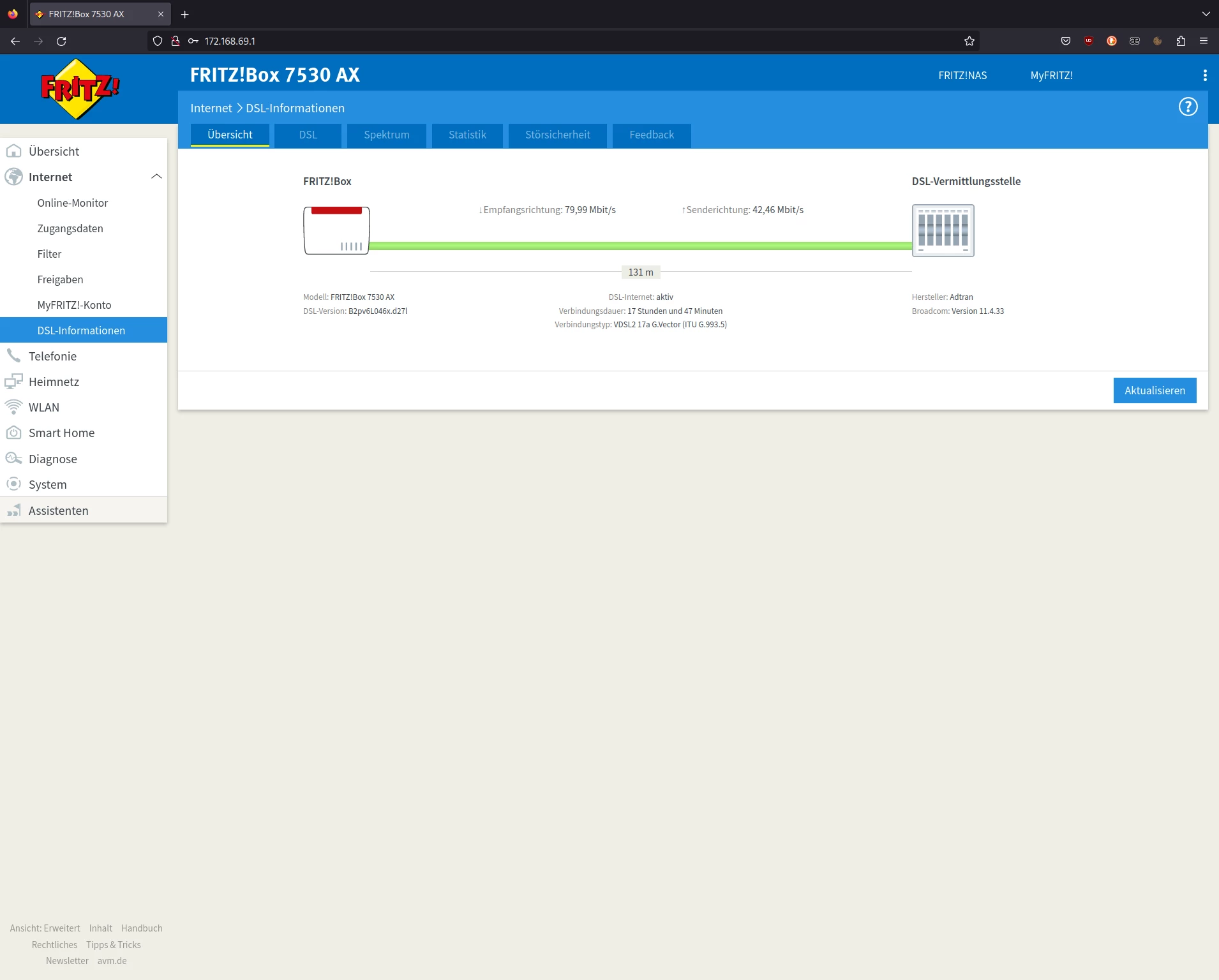 Leider hat sich der Router in den 3 Wochen wo ich hier wohne nun so oft neu verbunden, dass das DLM (Dynamic Line Management) meine Geschwindigkeit in Empfangsrichtung/Senderichtung auf 80000 / 42463 Kbit/s deckelt. Anfangs hatte sich der Router noch mit den vollen 116 / 46 Mbit/s synchronisiert.