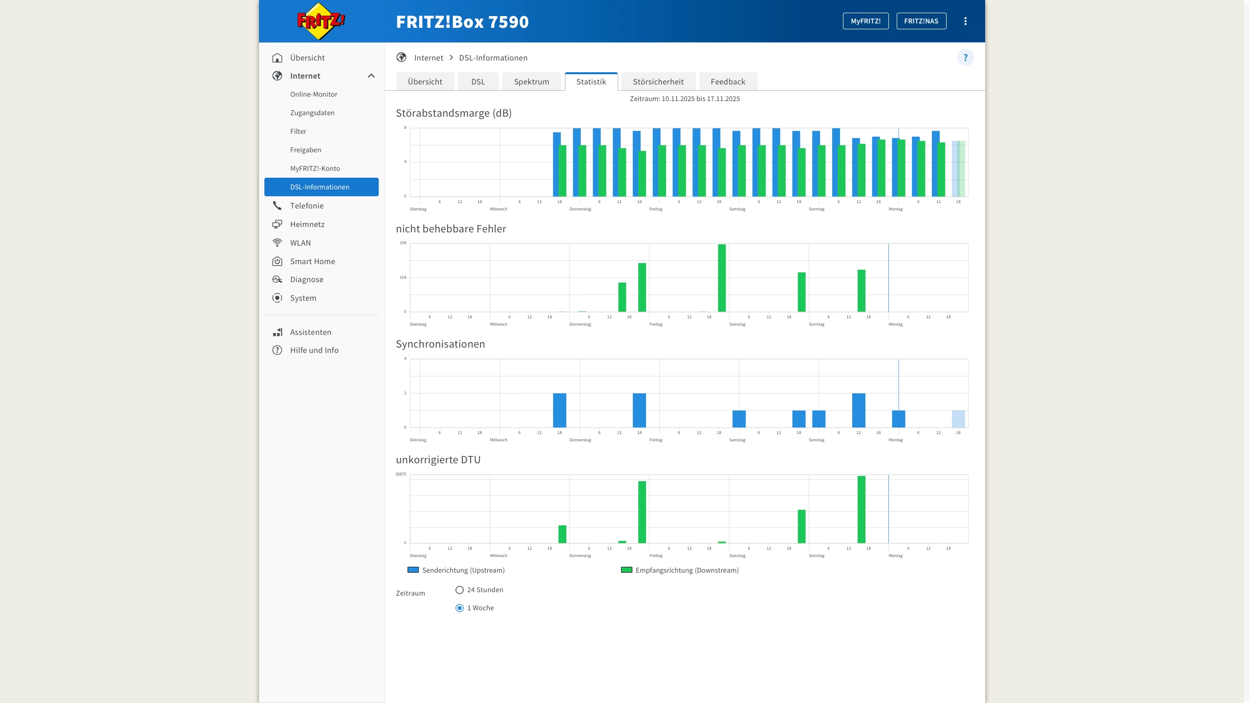 Noch eine Zusatzinformation: Die DSL-Synchronisation bricht im Schnitt 1x pro Tag ab und es dauert 5-10 Minuten bis die Box wieder online ist, Fehlermeldung in der FritzBox: (DSL antwortet nicht (Keine DSL-Synchronisierung). Ich spreche nicht von der 24-Stündigen Zwangstrennung, die ist ja regelmäßig in der Nacht, so wie in der Box eingestellt.