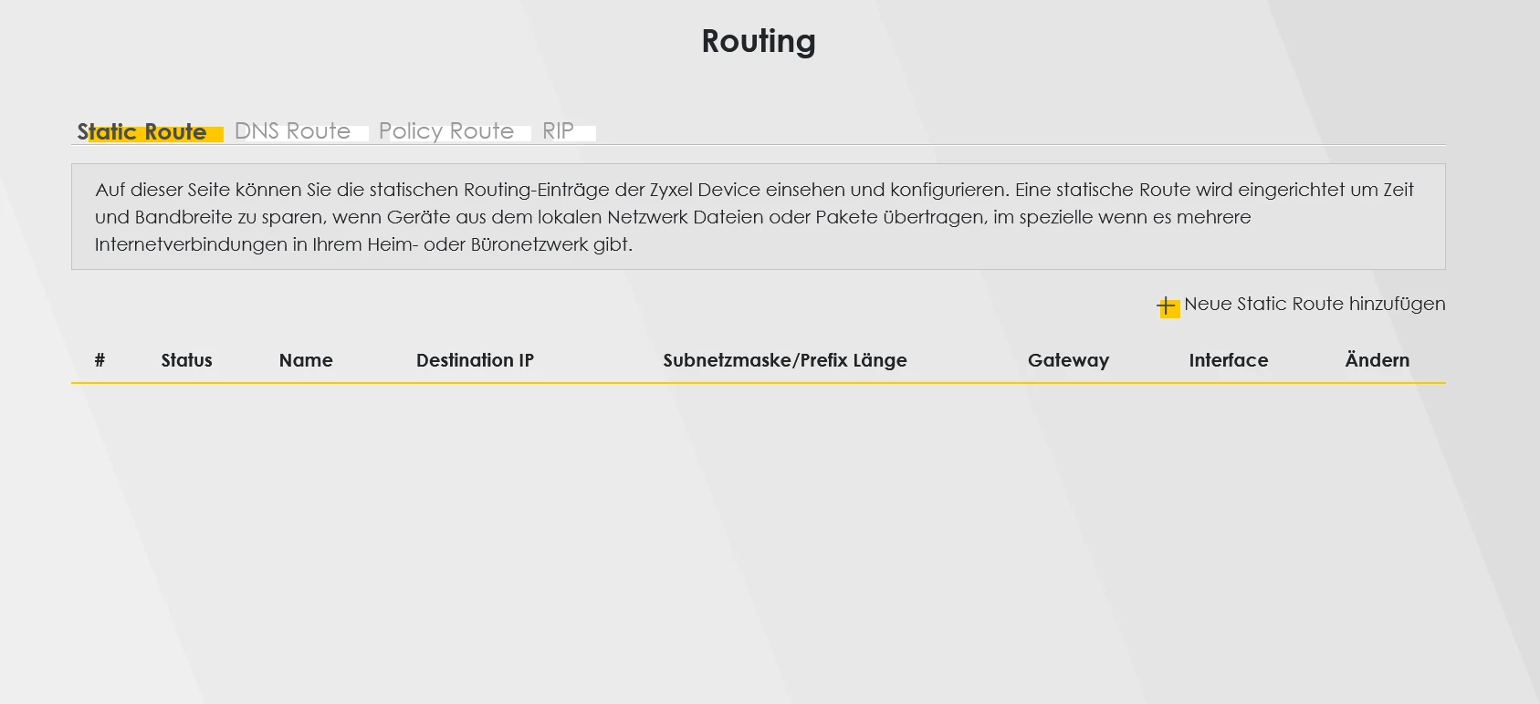 Beim Routing sind bei “Static Route”, “DNS Route” und “Policy Route” keine Einträge.