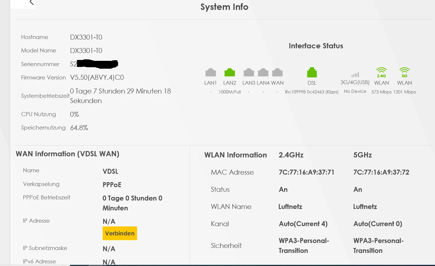 DHCPv6 hatte ich schon im Nachgang aktiviert. Eine DSL-Verbindung besteht, wenn ich diese Systeminfo richtig lese: