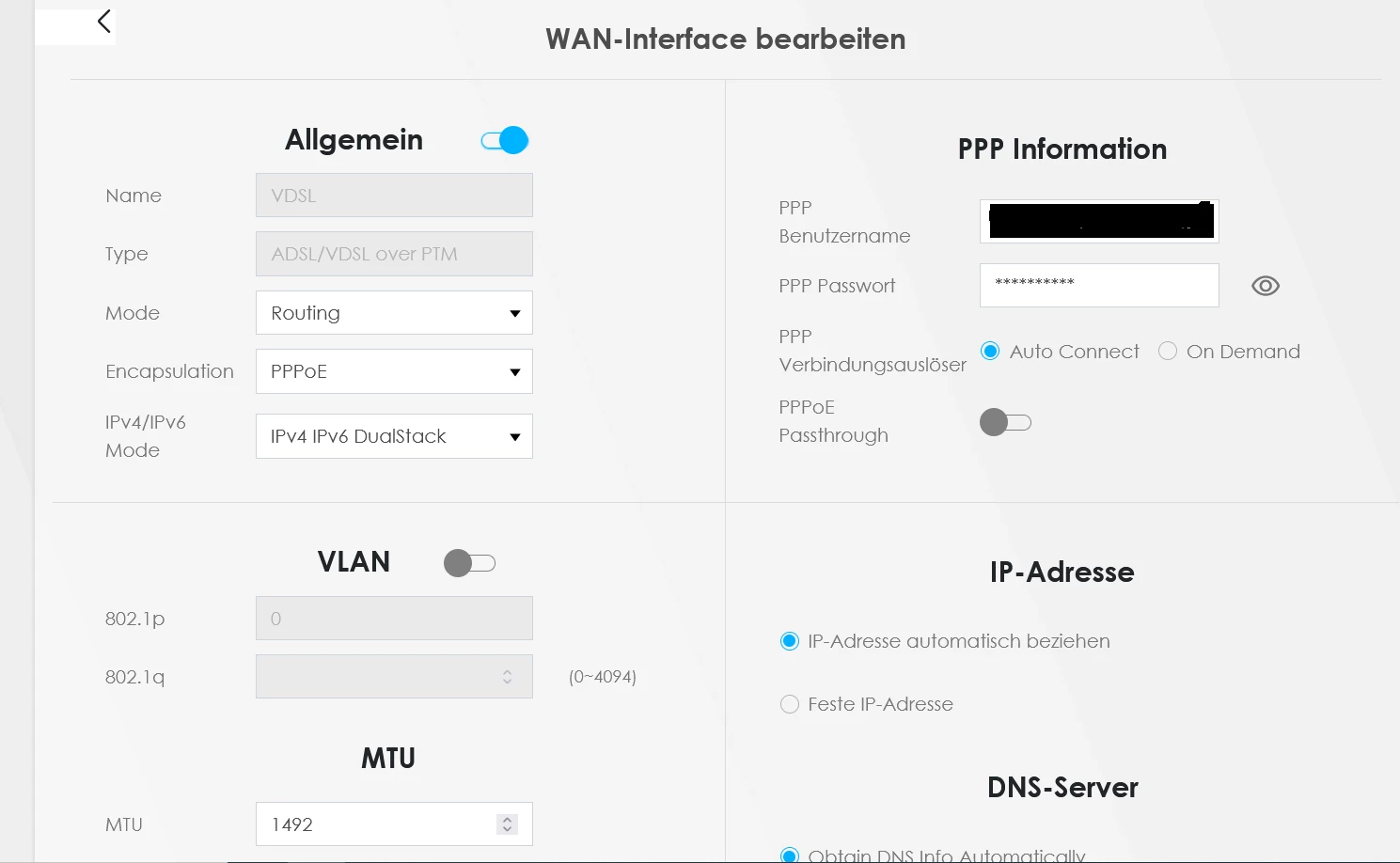 Die Einstellungen unter “Breitband” und da das “VDSL” habe ich hier drunter als Bild. Was muss ich da in welchem Feld ändern?