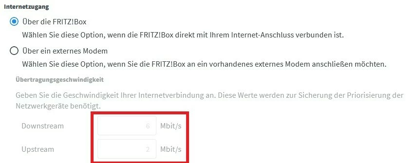 Im Reiter Internet / Zugangsdaten gibt es unter den Verbindungseinstellungen die Auswahl über FritzBox oder externes Modem die Internetverbindung herstellen. Obwohl bei mir hier die Fritzbox ausgewählt ist, übernimmt diese die ausgegrauten Werte, welche beim externen Modem eingetragen sind. Das Entfernen dieser Werte hat ausgereicht um die volle Bandbreite wieder zu erreichen.