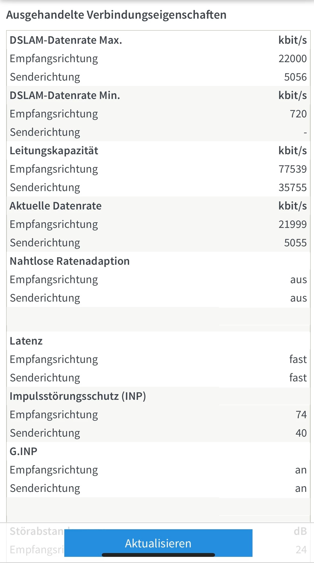 Es war ja zwischendurch mal ein Techniker der Telekom da. TAE war in Ordnung und die Messung bis zum Knoten war einwandfrei. Keine Erdschlüsse oder sonstiges was auf marode Leitungen schließen lassen könnte. In den Spitzen waren bis zu 120MBit möglich.
