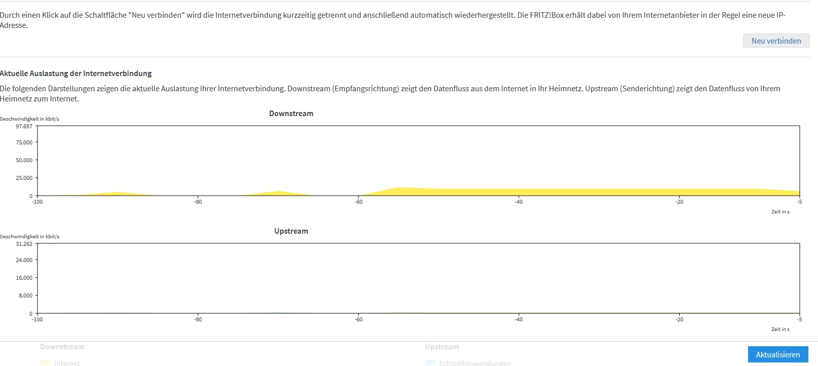 Laut AVM zeigt es nicht die tatsächliche Geschwindigkeit an. Ich habe zur Probe mal etwas heruntergeladen und der Downstream der Fritzbox zeigt ganz andere Werte an. Die Fritzbox wurde ausgetauscht weil unsere Videos aus dem Internet verpixelt waren. Das war im Mai 2019. Davor war alles korrekt, nach dem Tausch der Fritzbox wurde der Fehler korrigiert und seit mitte Juni war dann plötzlich der langsame Downstream.