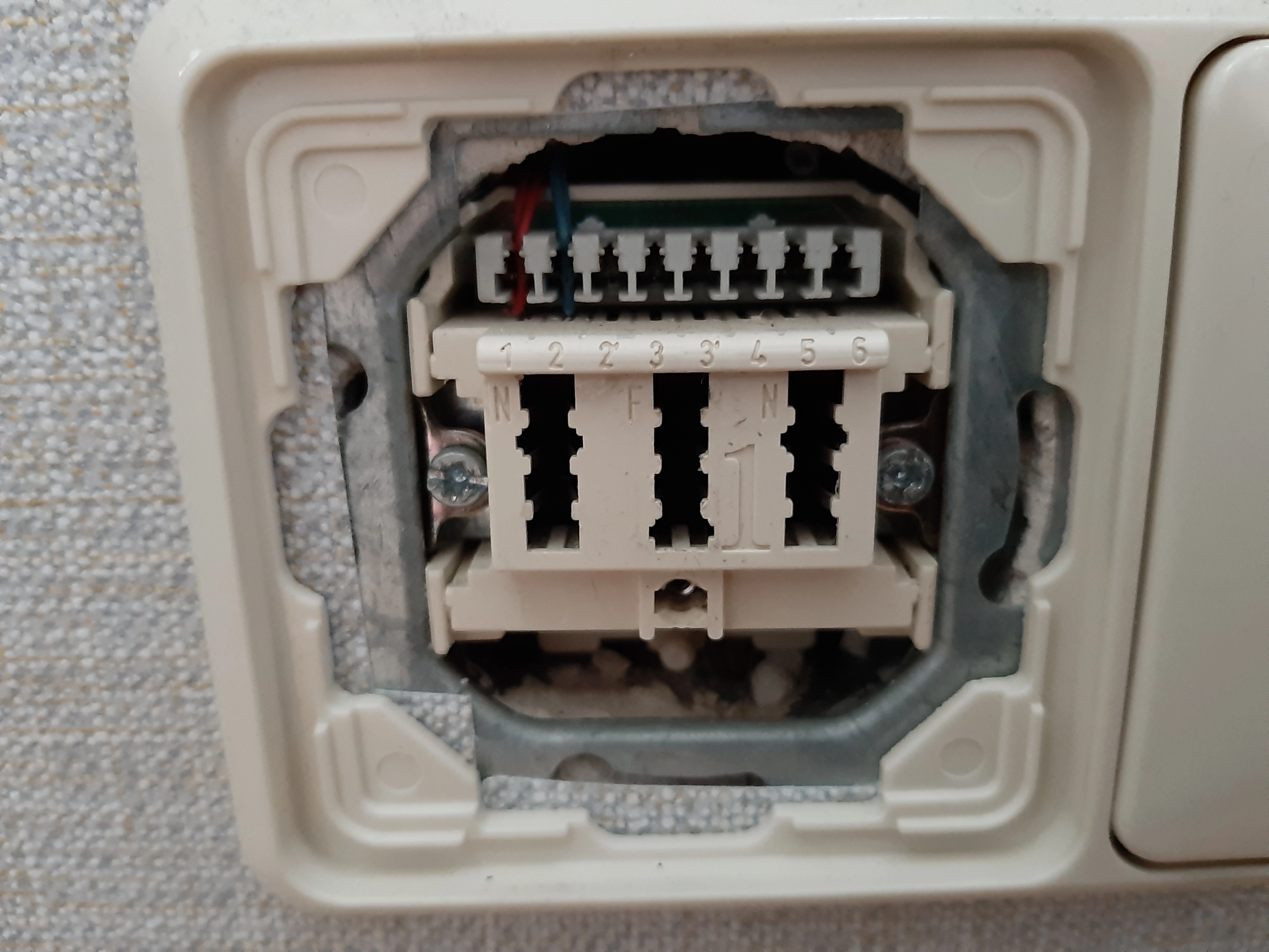 Diese Dose ist falsch verkabelt. Man sieht auf Stift 1 zwei rote und auf Stift 2 zwei blaue Kabel.