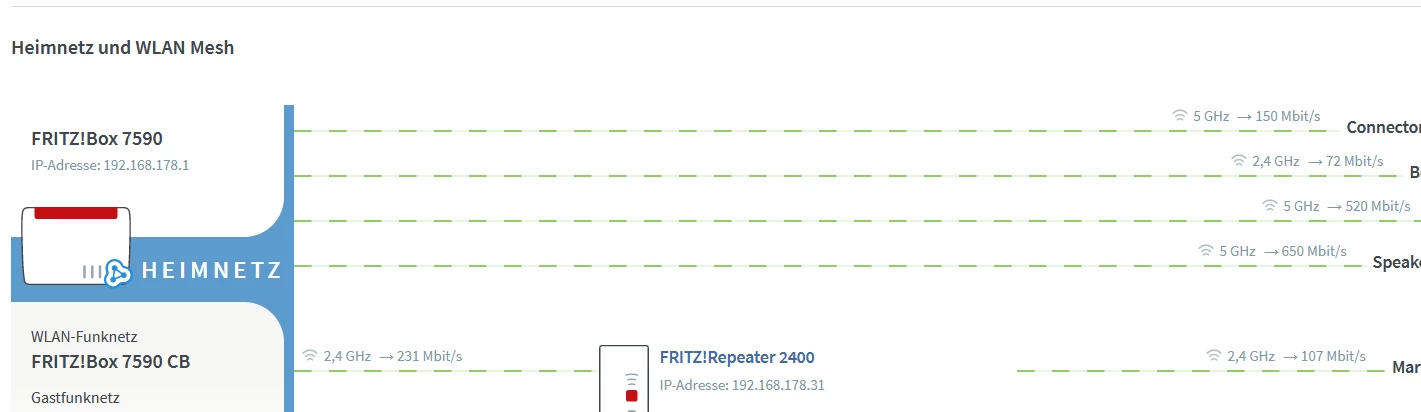 das müsste ich nochmal ausprobieren. Aber nach Umstöpseln sah das in der Fritzbox so aus. Ich habe heute nochmal Breitbandmessungen durchgeführt. Laptop am Lan 75 Mbit/s, Laptop neben dem Router 55 Mbit/s, Laptop 4 m vom Router entfernt aber direkt neben dem Repeater 20 mbit/s. Ist so ein krasser Verlust normal? oder tuts der Repeater nicht korrekt?