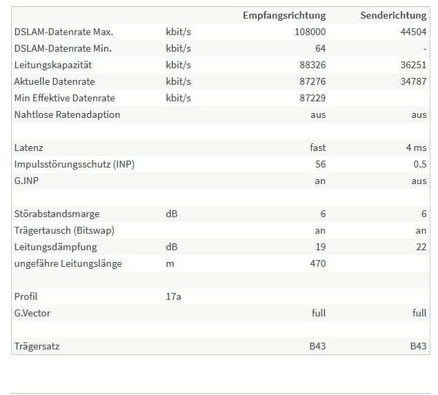Ich habe den Nachmittag mit der Störungshotline verbracht und bin zuletzt an einen “alten Hasen” geraten: Wir hatten aus ursprünglichen 2 eigenen Telekomdosen die Leitungen verdrahten lassen um beide Anschlüsse mit einer Nummer bedienen zu können und der Router hing an der leistungsminderwertigen. Nach Umstöpseln auf die 1. Dose und Deaktivieren meiner Autostartprogramme habe ich nun folgende Werte: