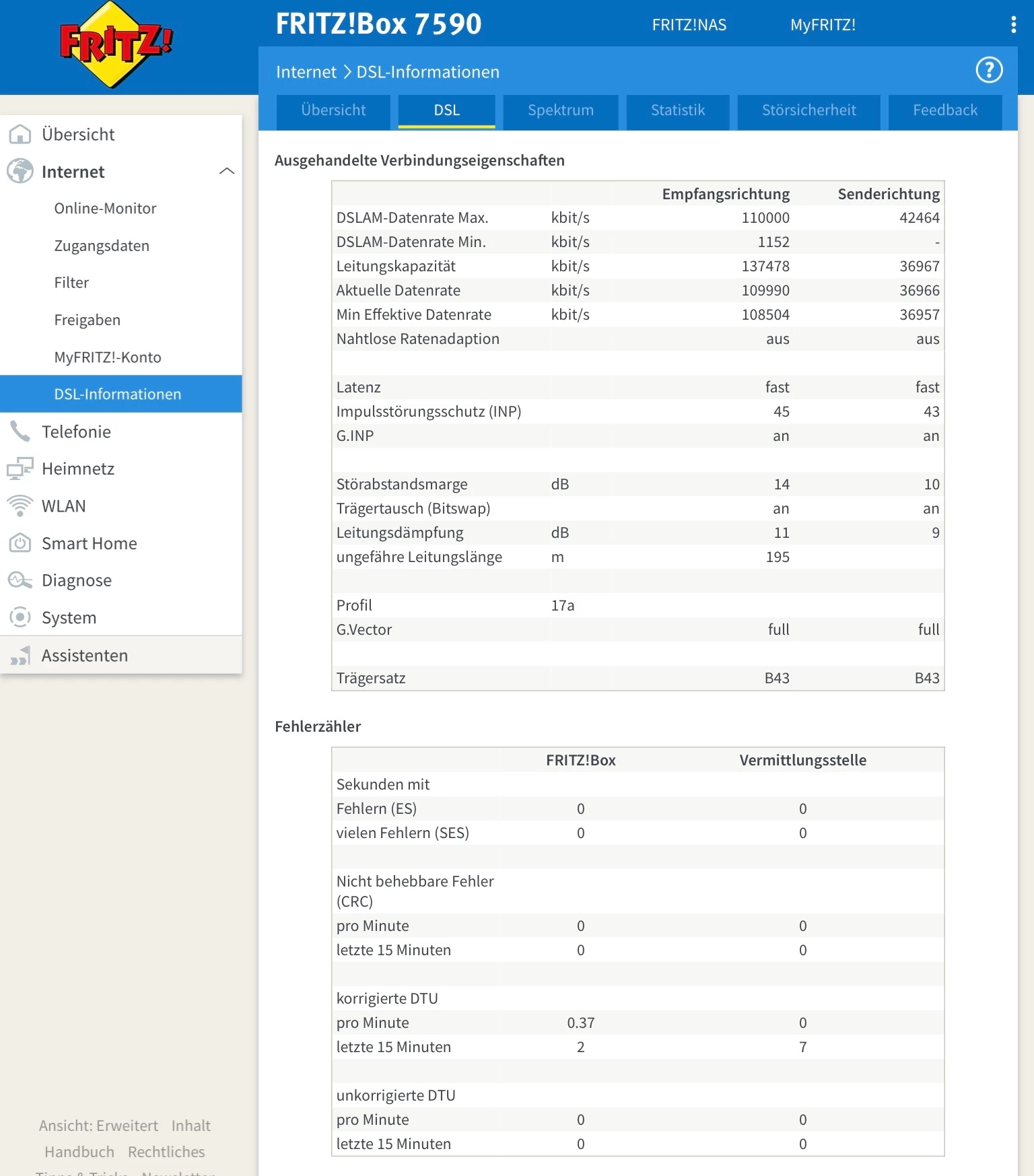 Hallo, ich habe einen DSL Vertrag über 100 Mbit/s seit 12/2018. Ich habe im September 2019 eine Breitbandmessung durchgeführt und kam auf 55,41 Mbit/s; im Download und 32,96 Mbit/s im Upload Laufzeit 25ms. Ich habe über die vergangenen Tage gemessen und komme nun auf 4,36 Mbit/s im Download und 0,83 Mbit/s im Upload. Laufzeit 85 ms. Daher habe ich die Messung nochmals durchgeführt und das LAN angeschlossen und alle Wlan Geräte ausgeschaltet. Hier komme ich auf 5,10 Mbit/s  und 0,93 Mbit/s und Laufzeit 36ms. Die Fritzbox 7590 CB ist auf dem aktuellen Stand und ansonsten ist an den Hausleitungen keine Veränderung durchgeführt worden.