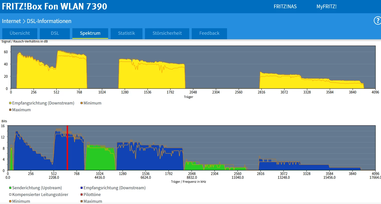Bitte entferne daher nochmals die PLC-Adapter, starte die Fritzbox neu und poste dann einen Screenshot mit aktivierter min/max-Anzeige. Zudem bitte einen Screenshot der Tabelle “DSL”. Normalerweise müsste die FB 7390 mit vollen 63.680 kbit/s syncen.