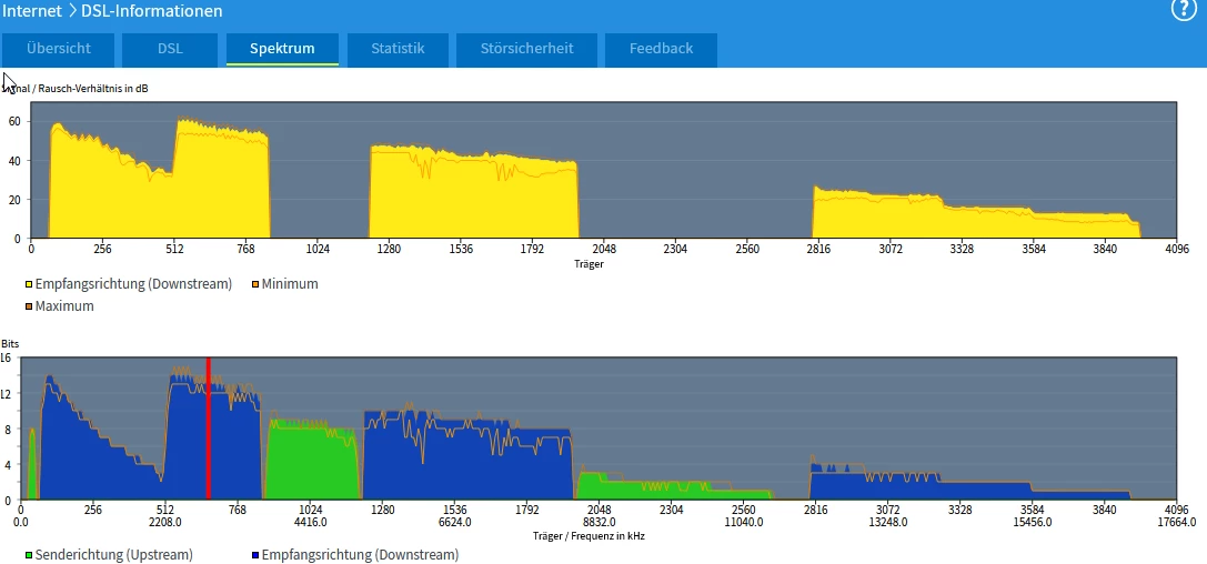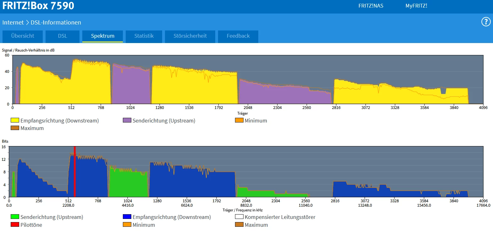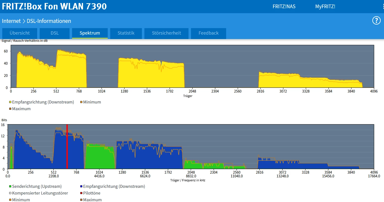 Ich sehe gerade (an einer anderen 7390 gegengetestet), dass man bei der 7390 die min/max-Anzeige des Spektrums nicht zurücksetzen kann (geht nur bei höheren FW-Ständen ab 07.00). Hier ist leider ein Neustart der Fritzbox über die Benutzeroberfläche - bitte nicht über Stromstecker-Ziehen - erforderlich.