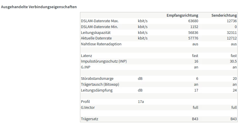 @o2_Lars Das Profil mit 63.680/12.736 kbit/s ist ein ASSIA-VDSL50-Profil (max. DSLAM-Rate). Das ASSIA-VDSL100-Profil hätte 116.860/46.720 kbit/s max. DSLAM-Rate und 63.680/23.680 kbit/s min. DSLAM-Rate. Anscheinend hat die Telekom-Technikerin nach ihrem Einsatz wegen der Sync-Abbrüche ein VDSL50-Profil geschaltet.