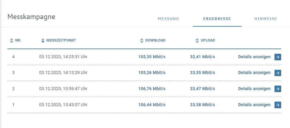 Ich habe gerade auch mal ne Messkampagne gestartet, da mein Upload nie die 40 Mbit erreicht, habe ich ja auch Anspruch auf Minderung.