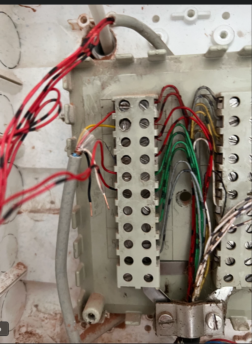 Das Adernpaar auf Klemme 1), also ganz oben links im Bild, ist vollkommen falsch verkabelt.