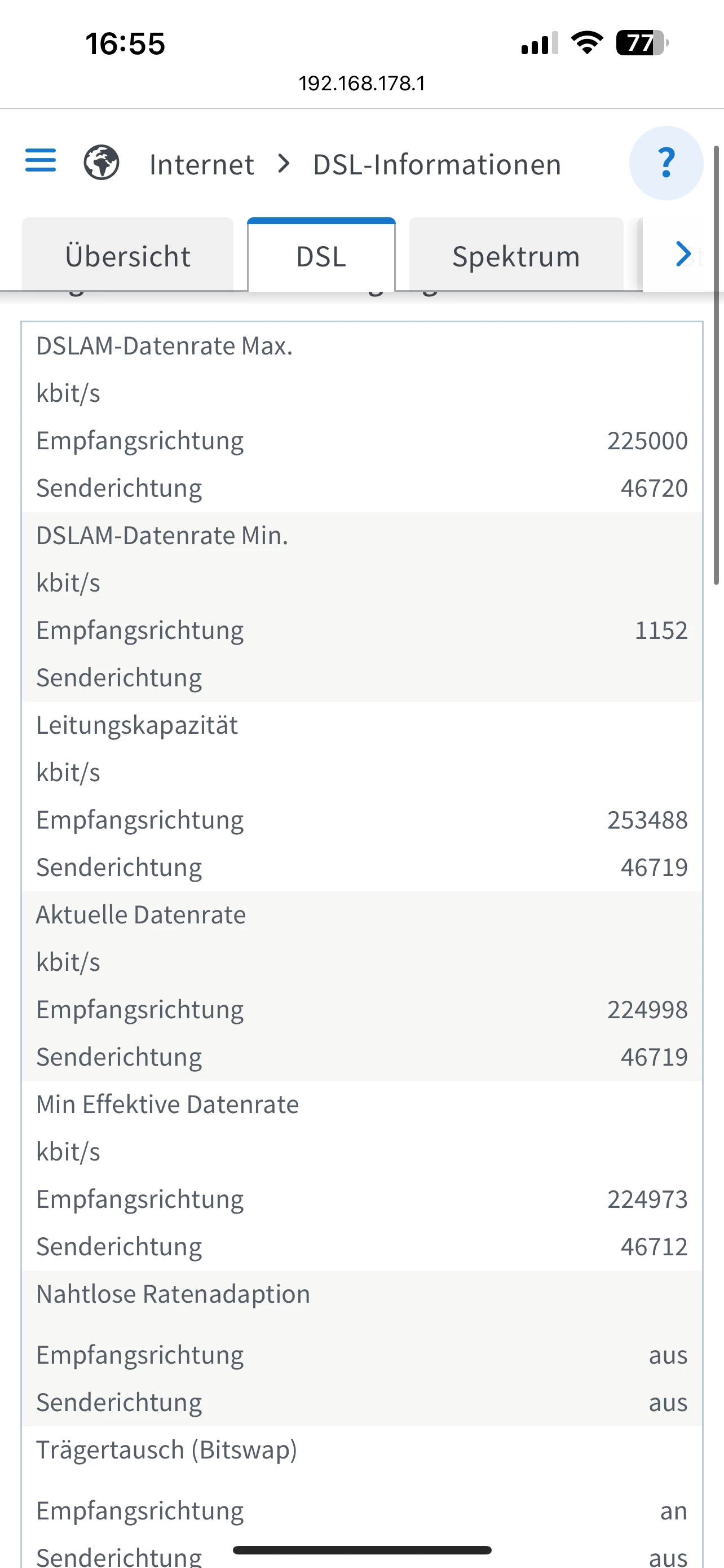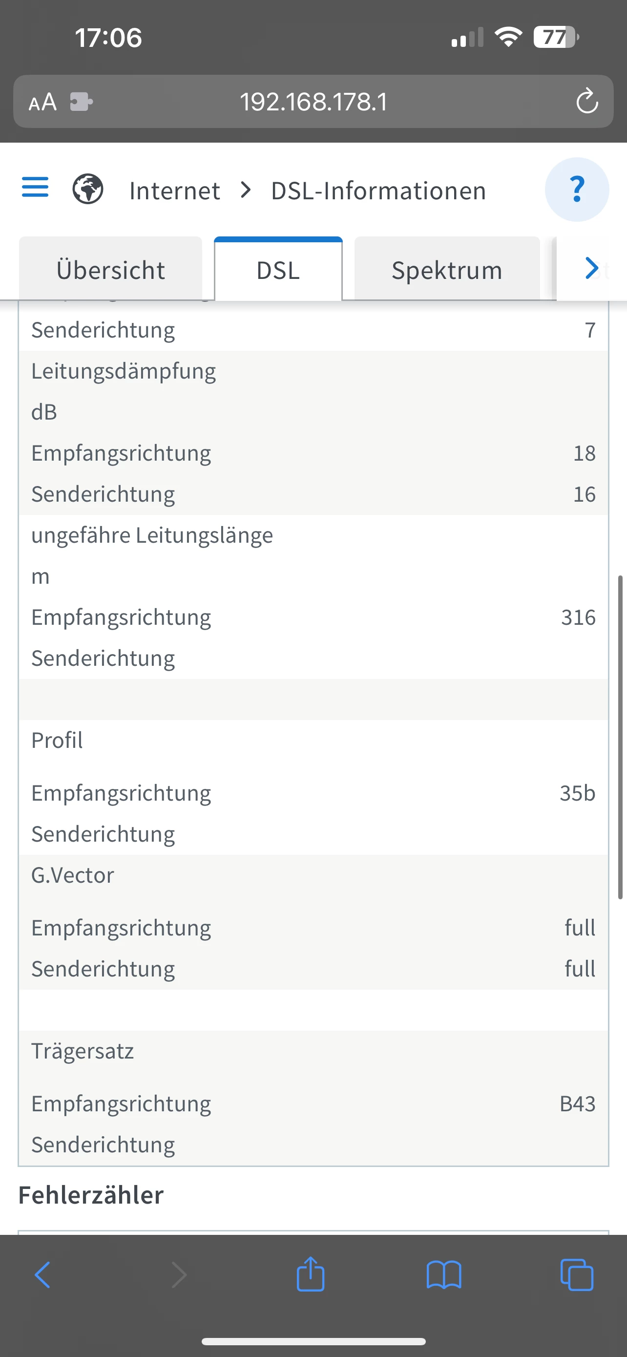 Wie sehen jetzt die DTU-Fehler und die Leitungslänge aus? Bitte vollständigen Screenshot der Tabelle “DSL” posten.