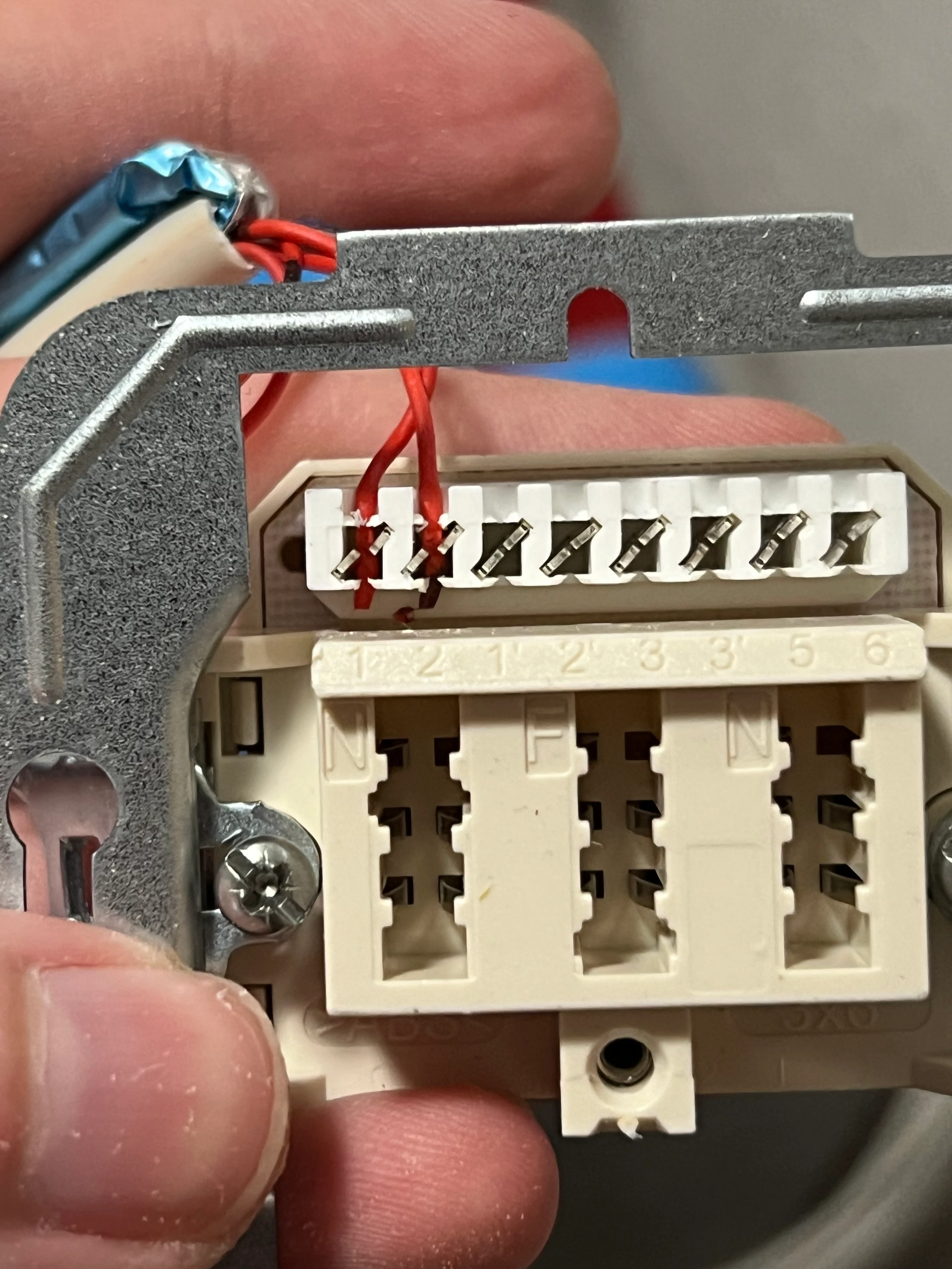 Bitte die zwei Adern herausreißen, einen Zentimeter davon abklemmen und nochmals fest mit dem LSA-Auflegewerkzeug und mit Kabelmantel anklemmen, damit der Kontakt auch wirklich 1A perfekt ist. Notfalls mehrmals nachtackern, wenn die Dose in der Wand ist.