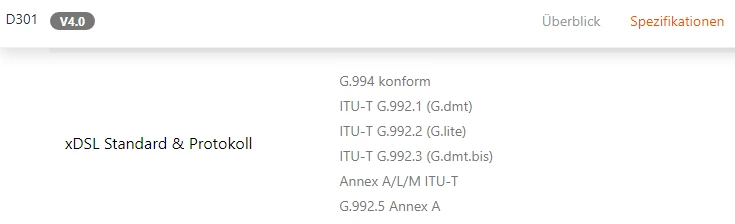 Das Gerät Tenda D301v4 entspricht nicht der Schnittstellenbeschreibung und ist offensichtlich auch nicht für die Nutzung in Deutschland vorgesehen. Anbei ein Bildschirmfoto der DSL-Spezifikation von der Tenda-Webseite: