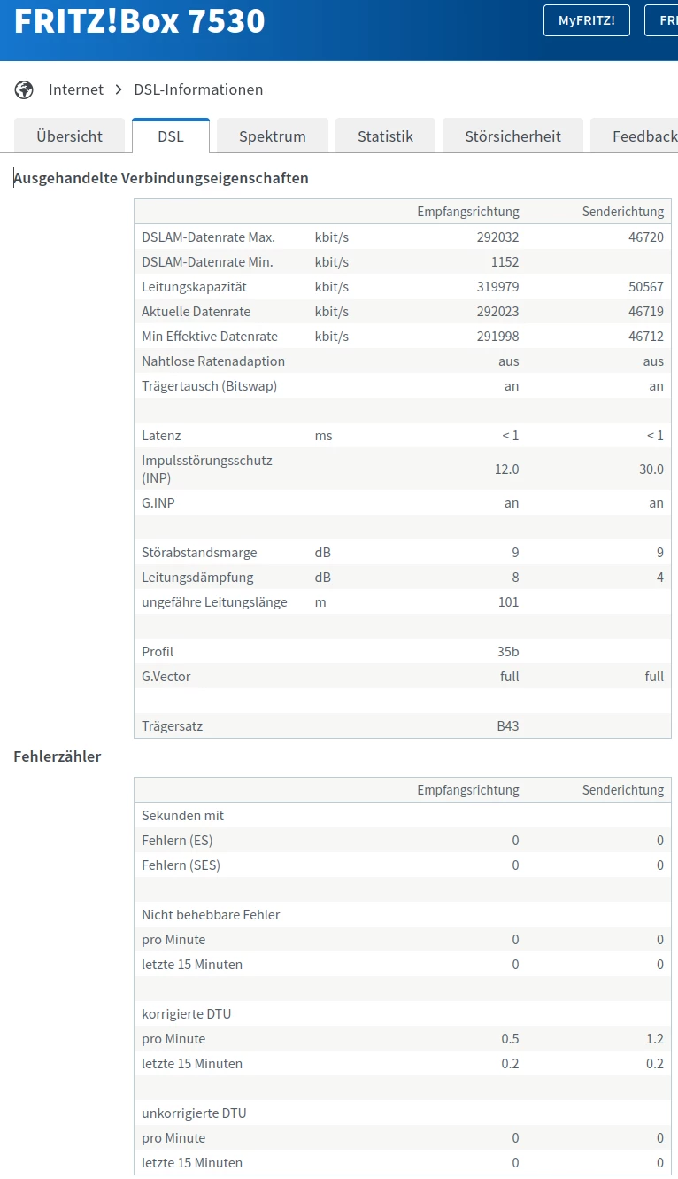 Der DSL Reiter in der Fritzbox-Seite sollte auch noch Fehlerzaehler beinhalten, vieleicht musst Du da erst runterscrollen um die zu sehen, die waeren hilfreich.