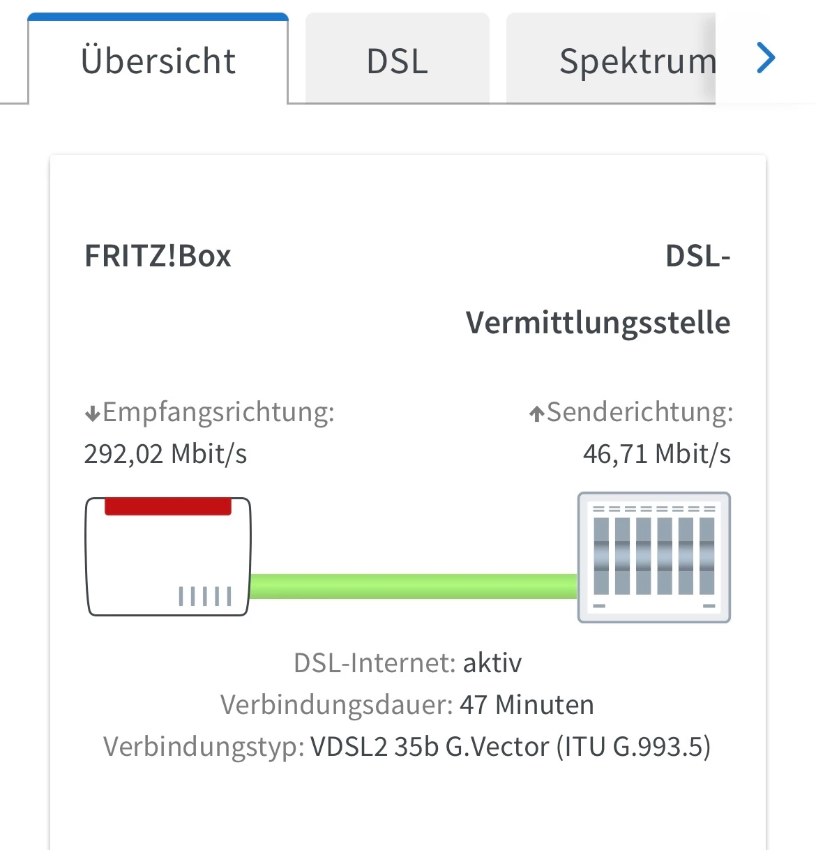 Wir haben von der Telefonbusche bis zum Router ein neues 10m DSL Kabel verlegt, es kommen auch laut Speedtest ca. 260Mbit/s an. Folgendes Problem tritt nach Stunden Zeit variiert auf das dann nur noch so zwischen 1-50 Mbit/s ankommen. Nach dem  wir die FRITZ!Box 7530 neu verbinden lassen kommen wenn es klappt wieder die volle Geschwindigkeit an.