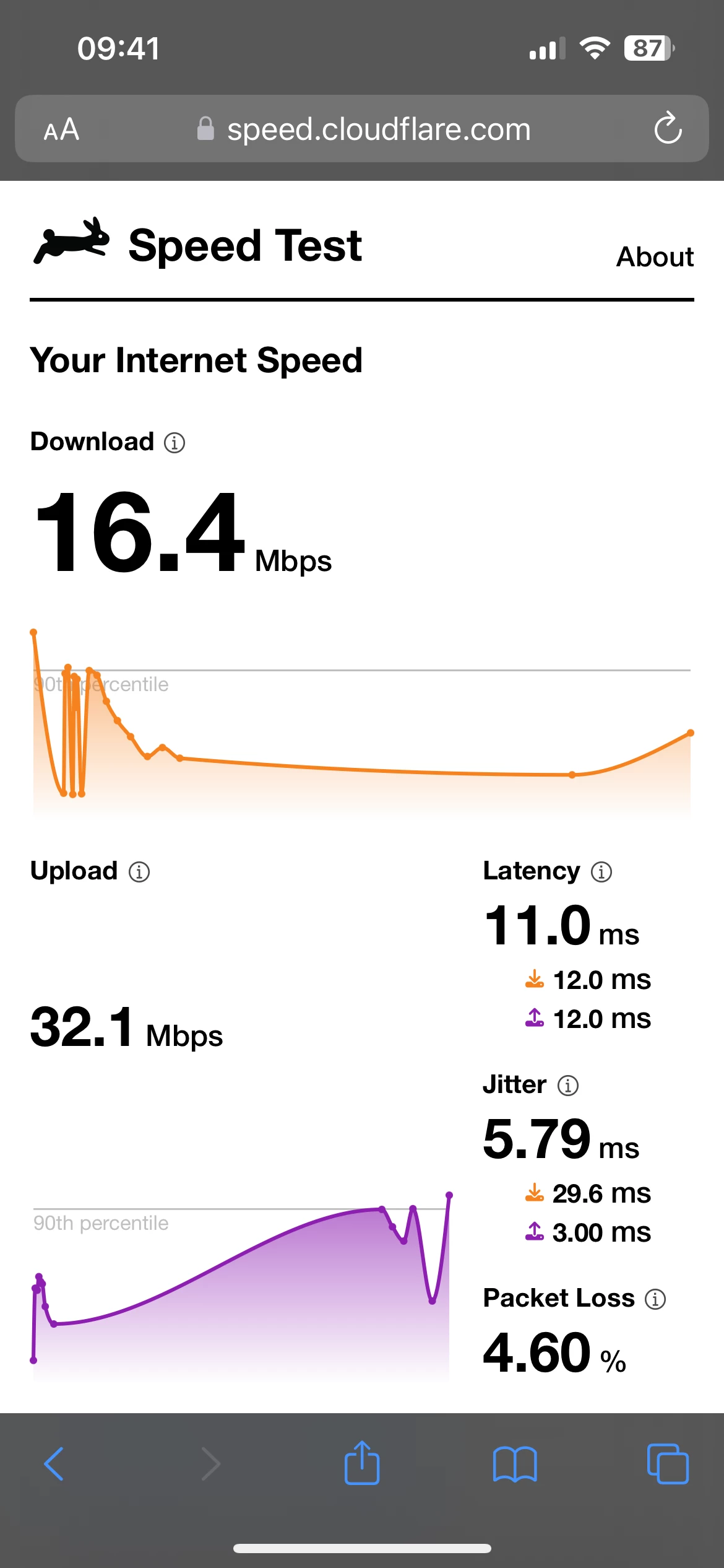 Und bitte poste einen screenshot eines abgeschlossenen speed.clouflare.com “Speed”-Tests*.