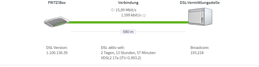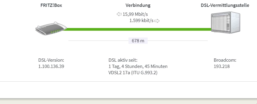 mein Dsl Anschluss ist seit Tagen sehr langsam, bzw. Statt 25mb habe ich nur noch 12mb, Upload ist bei 130kbits. Ich habe einen fritzbox 7490,splitter da ohne Ich keine Verbindung zu den Dsl nicht aufbauen kann. Ich habe einen neues lan cat7 Kabel gekauft sowie den Splitter, hat nichts gebracht. Router würde zurückgestellt, auch nicht. Dslam in den box liegt bei ungefähr 16000. Entfernung von der Vermittlungstelle ca 650m. In 65185 Wiesbaden Mitte
