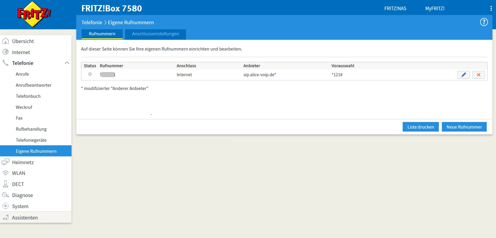 In der Fritzbox gehe ich im Menü Eigene Rufnummern auf Anschlusseinstellungen und gebe Landes- und Ortsvorwahl sowie die Durchwahl ohne Vorwahl an.