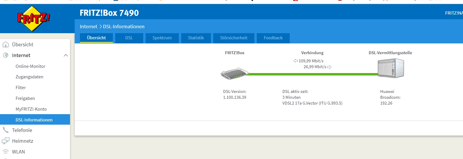 DSL ist verfügbar (DSL-Synchronisierung besteht mit 109996/31999 kbit/s).