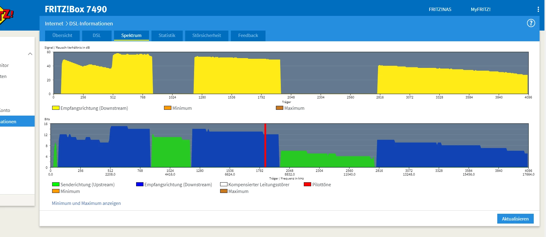 Genau die Krankheiten zum Start. Da wird auch irgendwann 136 stehen im Download dann 116 und dann wirst du morgens mal 30 MBit haben. Neustart am Morgen verhilft dann zum alten Wert. Dein Upload wird irgendwann fest auf 27 MBit hängen für 1-2 Wochen, dann auf 36 und irgendwann wieder auf 42. Die Abstände werden dann geringer und die Leitung immer besser. Dein Spektrum wird auch mal aussehen wie eine Säge. Wenn es fertig ist, glatt wie eine Eisfläche.