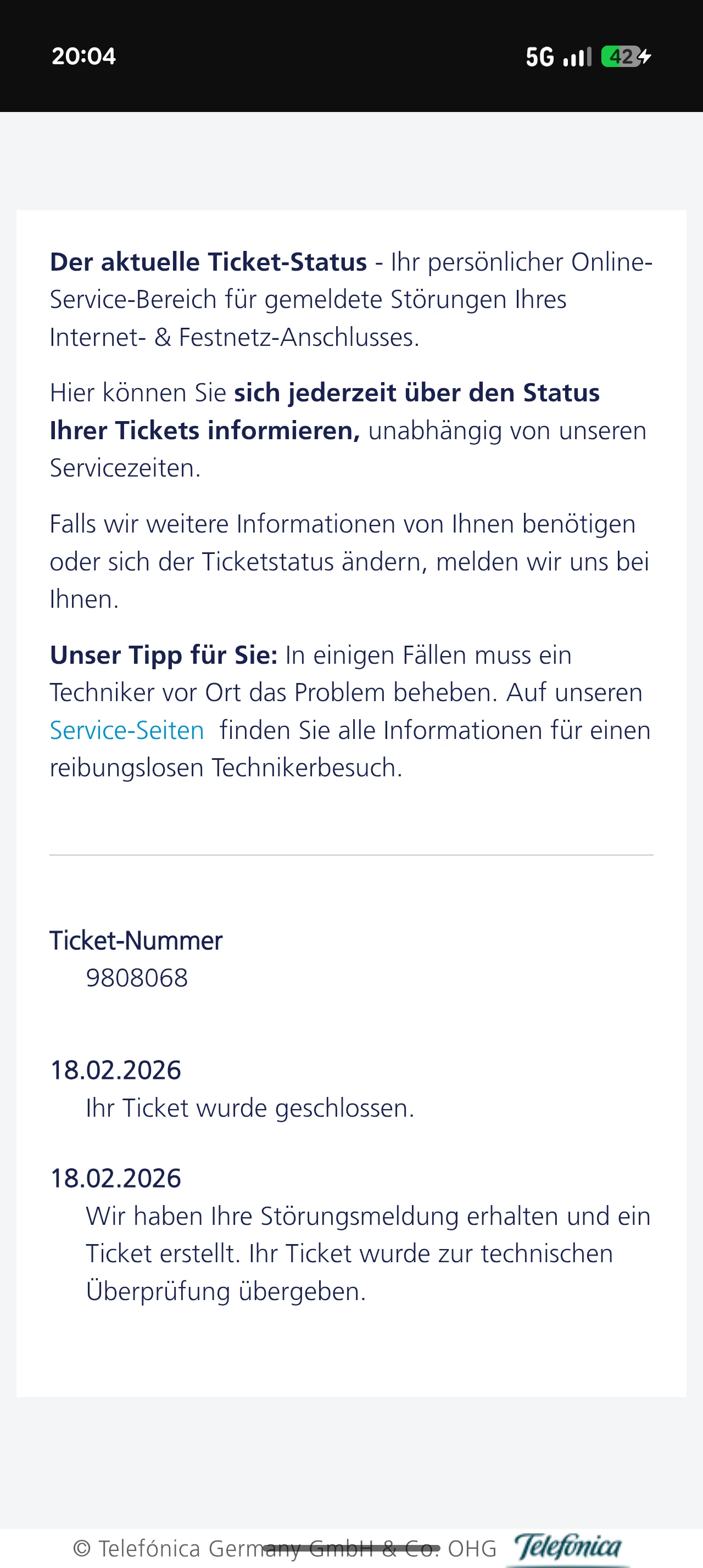 Ich habe dazu ein Ticket über die o2 Service App eröffnet. Wunderbar...schnell eine Nachricht bekommen bzgl. einer Störung. 5 Minuten später wird das Ticket wieder geschlossen.Wieso? War es das jetzt seitens o2? Und jetzt?