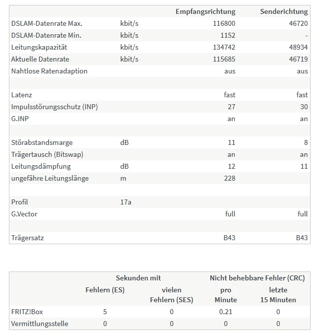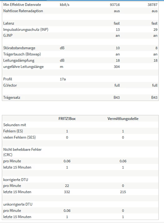 2. Techniker: Hat an der Vermittlungsstelle den DSLAM getauscht und einen line reset gemacht. Meinte es passt jetzt. → keine Besserung