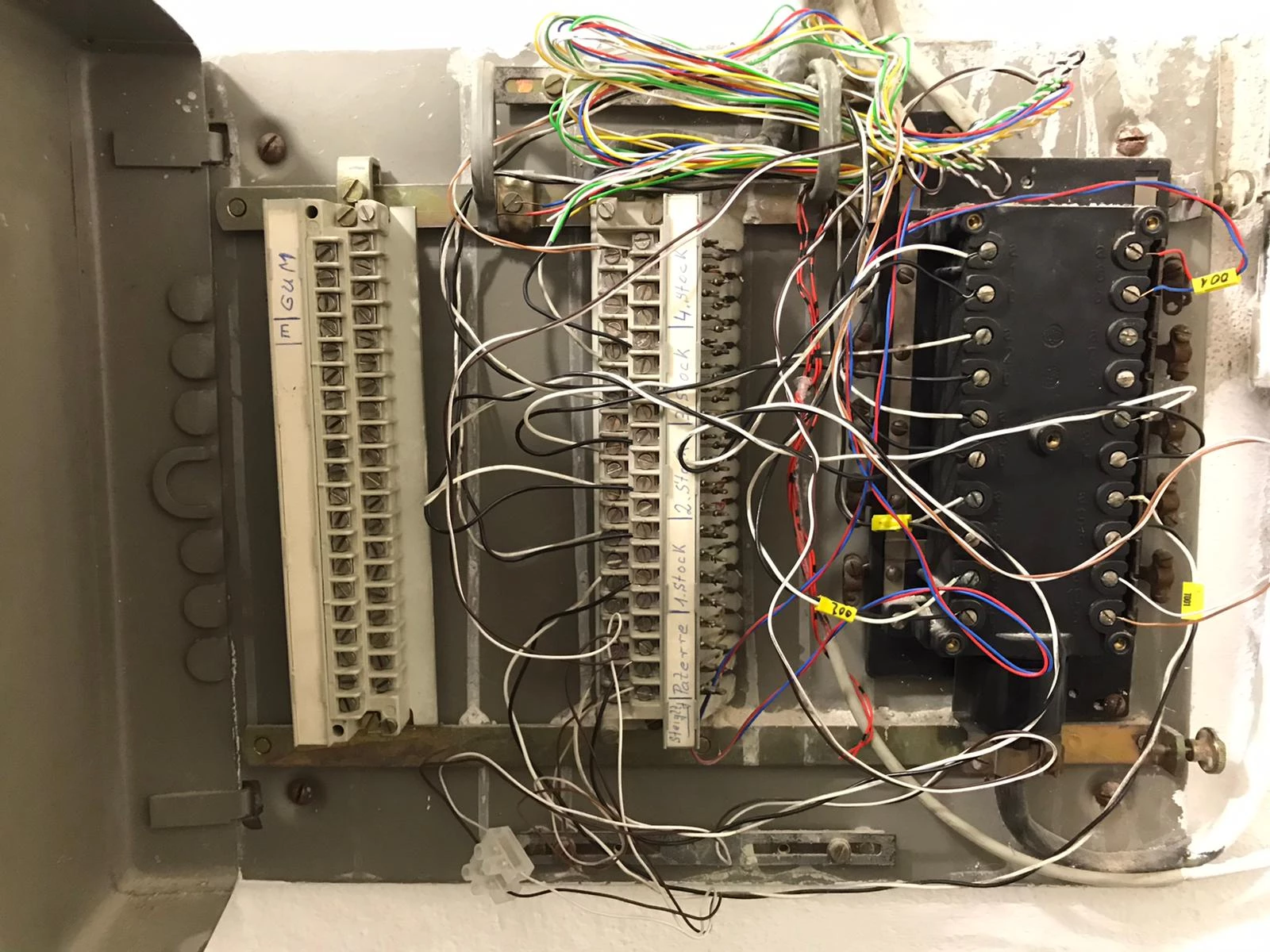 Ich habe auch im Keller am APL das rote  Kabel mit den schwarzen Ringen gefunden. Scheint also doch durch zu laufen. Die beiden Adern kommen auch an der mit 2. Stock beschrifteten Stelle raus. Da sind die Kabel gelötet und gehen dann über eine Schreubverbindung mit der Kombi weiß Schwarz zu der der schwarzen Leiste ganz rechts in dem anderen Bild vom APL.