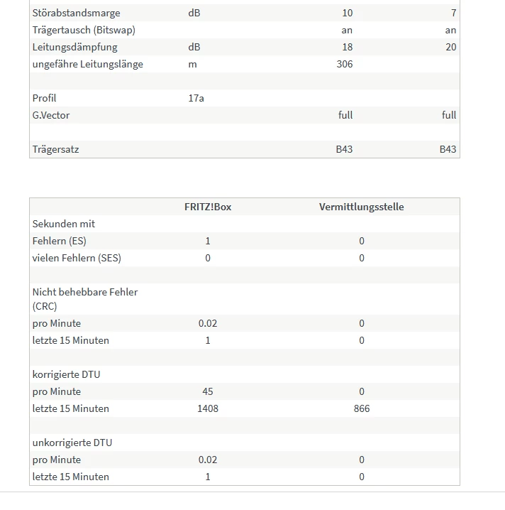 In der Fritzbox sieht man auch, dass die Leitungslänge von 228m (Dämpfung ~12) auf 319m (Dämpfung ~20) gestiegen ist. Die Vergleichswerte stammen von der Zeit bevor wir Probleme hatten. Die Leistungskapazität ist entsprechend auch geringer.