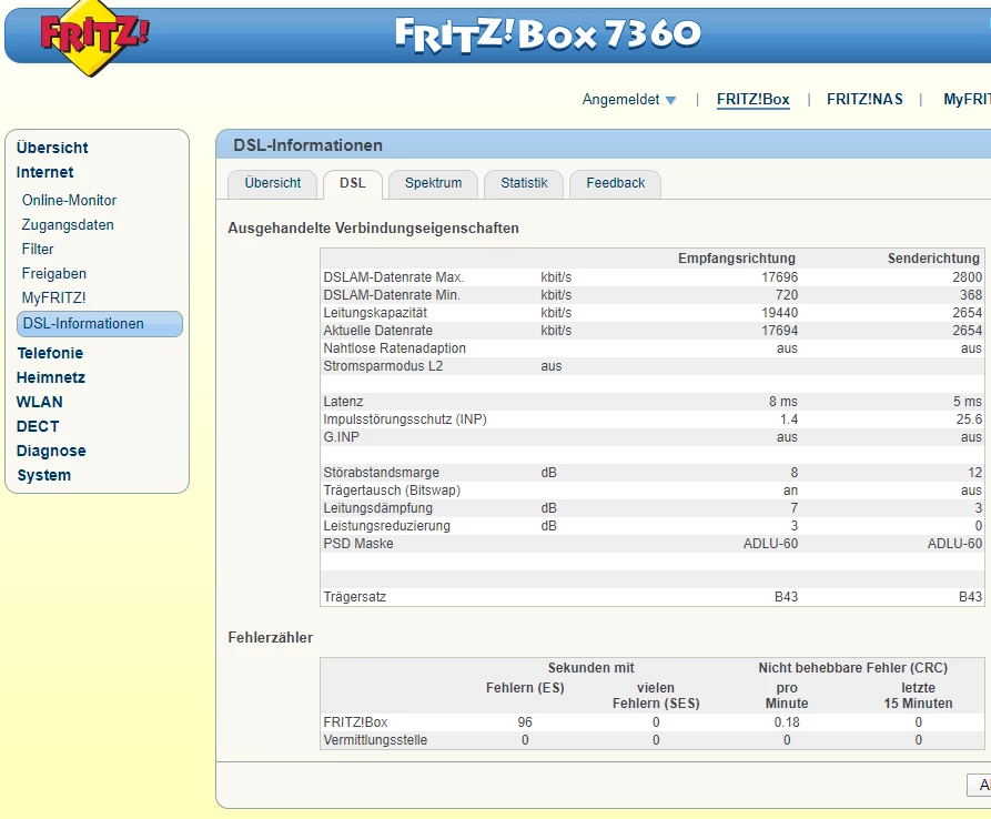 Poste bitte die Tabelle unter “DSL”, in der alle Leitungsparameter ersichtlich sind.