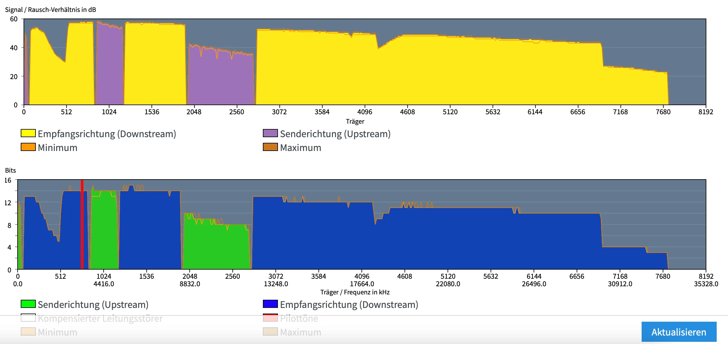 Vom Spektrum her sieht das ganze ziemlich schick und sauber aus, normalerweise wird die Synchronisation auch bei Supervectoring nach oben hin eher relativ offen gefahren, es kann sein, dass da noch irgend etwas eingemessen werden musste oder sonstige Automatismen gegriffen haben…