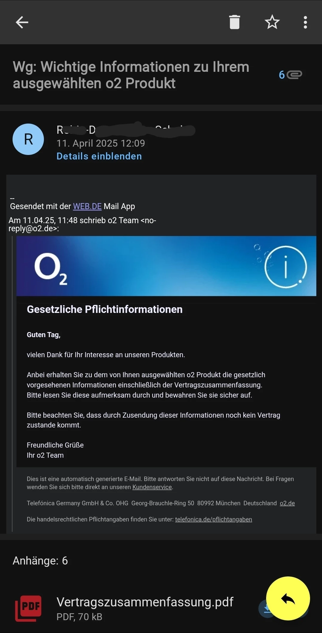 Ich meinte die Auftragsbestätigung vom 16.04.2025, die dir per Post geschickt wurde. Hast du die nicht erhalten?