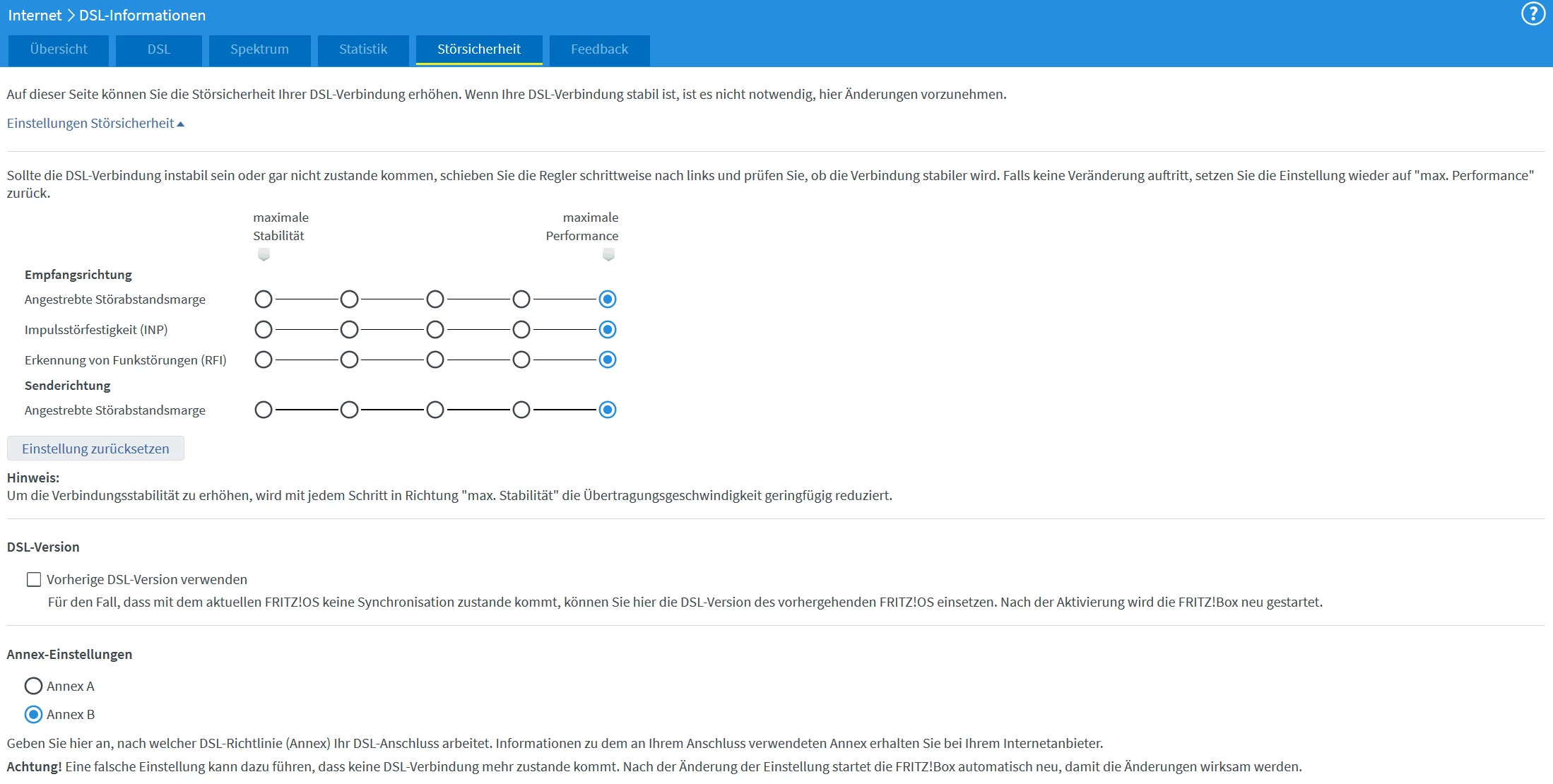 hier die gewünschten Screenshots. Optionen unter “Störsicherheit” weiterhin auf “maximale Performance” wie im Screenshot heute morgen zu sehen (siehe früherer Post).
