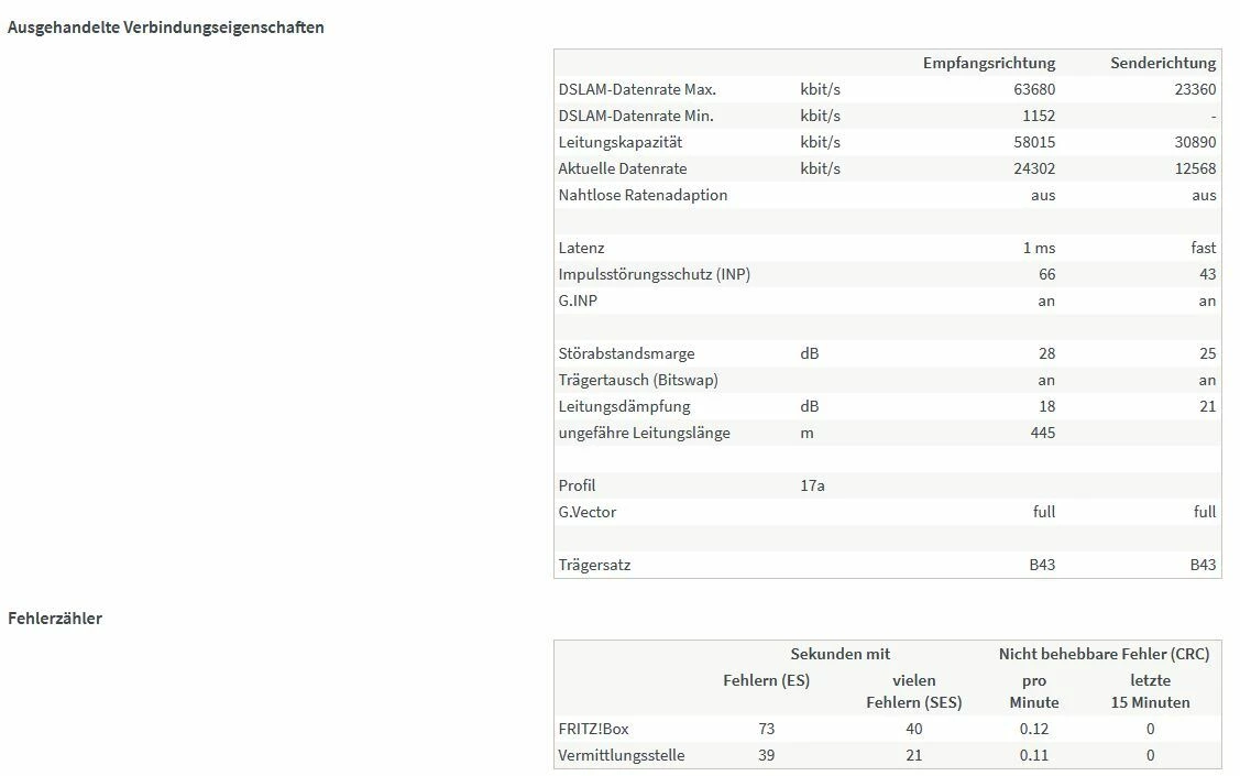 Mein Adtran Broadcom wurde anscheinend zwischen Ende April und Mitte Juni von 178.5 auf 178.18 geupdated. Ich habe die Blende der TAE Dose entfernt und teste auf Wackelkontakt des Anschlußkabels bzw. öffne die FritzBox. Aus Neugierde werde ich vielleicht eine 7530/7590 ausleihen, um zu sehen, ob diese mehr Leitungskapazität erreicht. Vielen Dank für alle Antworten!