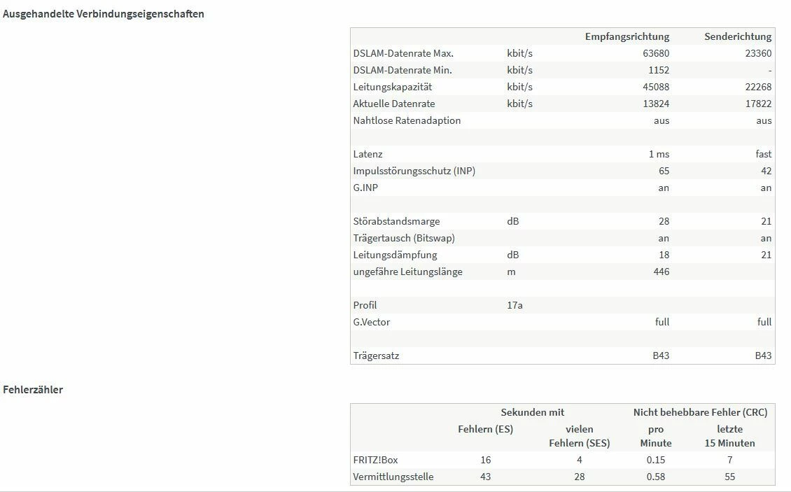 Der DSLAM stuft die Leitung schon herunter, bei 63680kbit/s schaltet der Netzanbieter bei mir keinen 100er Traif mehr. Die Geschwindigkeit liegt unterhalb des im Vertrag festgehaltenen Minimums von 50Mbit/s.