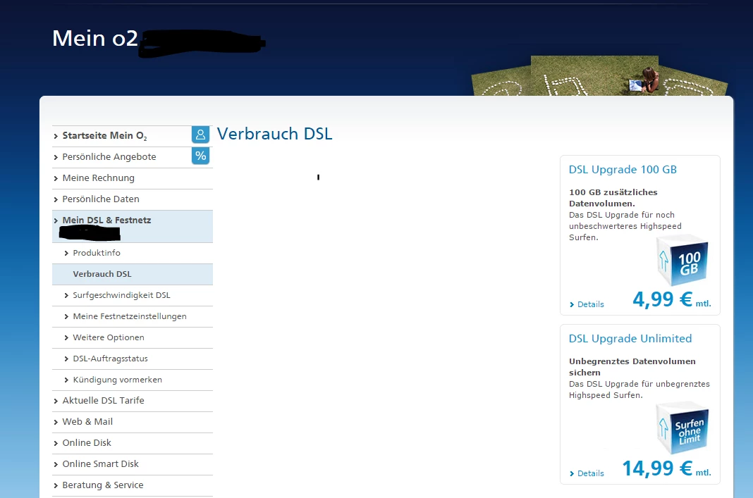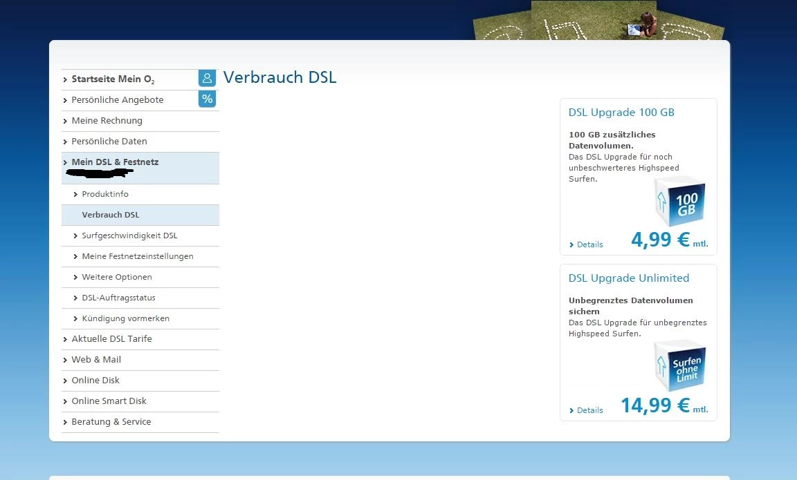 Unter Mein o2 -> Mein DSL & Festnetz -> DSL-Verbrauch scheint dies anscheinend auch möglich zu sein. Nur wird mir dort absolut nichts angezeigt, außer der Werbung dafür, dass ich mehr Datenvolumen buchen kann. Ich hab dies sowohl mit Chrome, als auch dem Internetexplorer getestet Ich möchte jetzt natürlich wissen, ob das Problem an meinem Ende oder bei o2 liegt.
