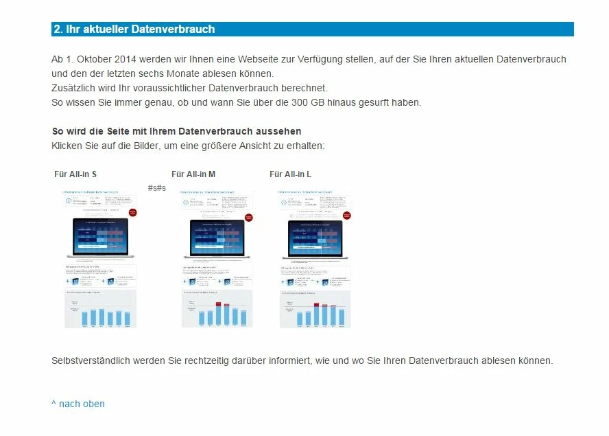 Gibt es eine Aktualisierung zu diesem Thema? Mir wurde mittlerweile vor über einem Monat Ähnliches erzählt. Mein All in L zeigt durchgängig 0 GB Volumen an, die Anzeige für den Juli fehlt z.B. komplett. Bekam zwar nie eine Mail mit dem Hinweis auf die 80% des verbrauchten Volumens, Gedanken mache ich mir aber schon.