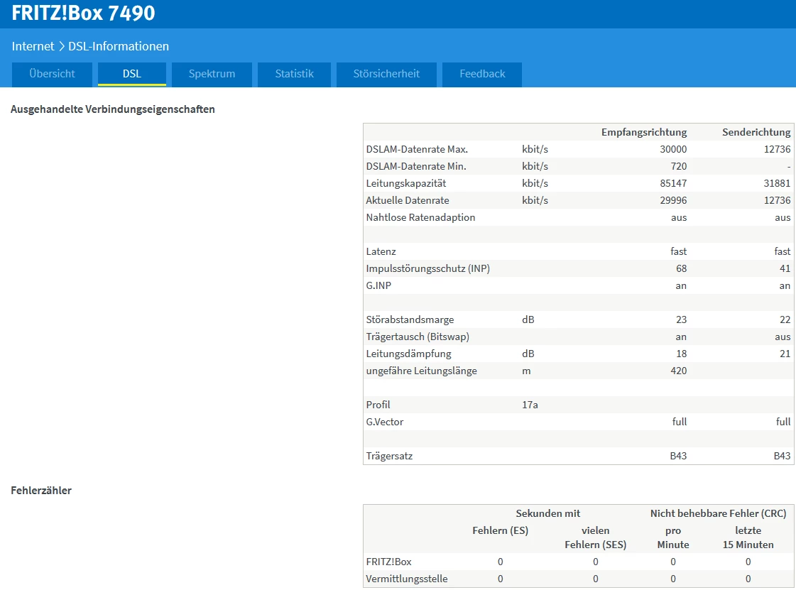 Vorher waren an dem Anschluss ca. 55.000 möglich. Dann gab es eine Zeitlang fehler in der Verbindung und die Geschwindigkeit sank. Die Hausverkabelung wurde gerade erst neu gemacht, es ist keine TAE Dose vorhanden, es wurde direkt eine CAT 6a Dose mit einem CAT 7 Kabel an den Hausanschluss angeklemmt.