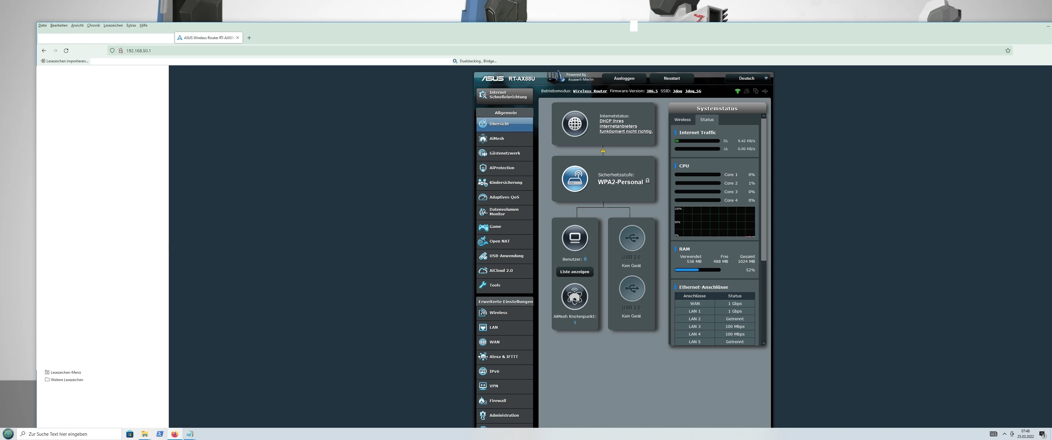 der in den Wan Eingang meines Asus RT AX88u führt, nun erhalte ich die Meldung
