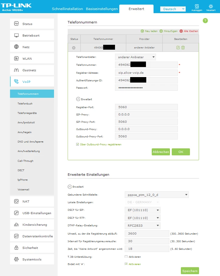Hier mal die Einstellungen, die ich bei VoIP gemacht habe: